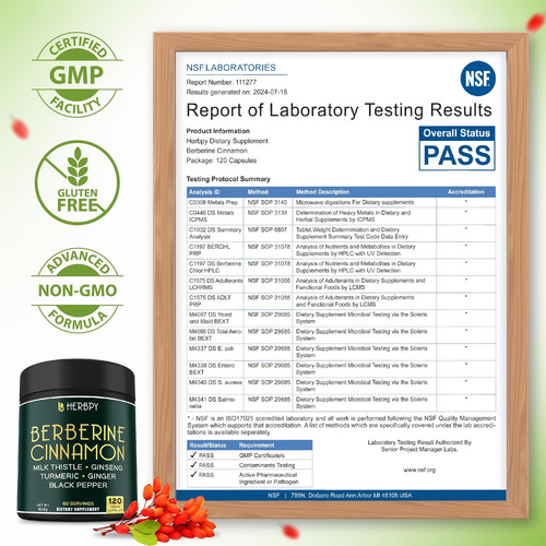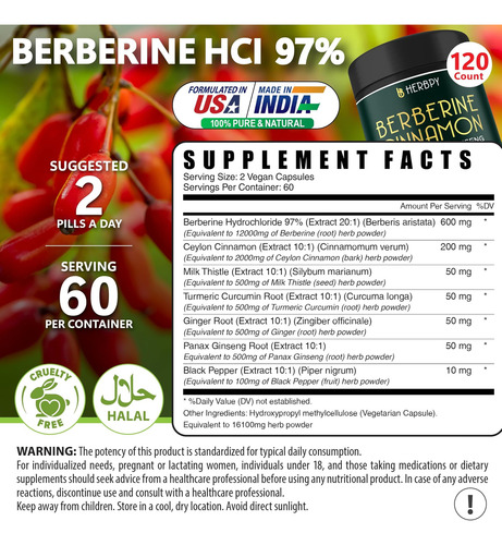 • As cápsulas do suplemento Herbpy Berberine são veganas, feitas com ingredientes 100% naturais, não geneticamente modificados e sem glúten. Os produtos são submetidos a testes rigorosos em laboratórios ISO te…