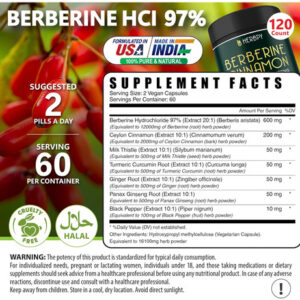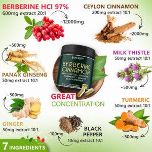 • 7 em 1 Elaborado cuidadosamente – Excepcional Cloridrato de Berberina Pura (HCl) 97% extraído da raiz de Berberis Aristata, além de Raiz de Curcumina de Cúrcuma, Cardo Mariano, Raiz de Gengibre, Raiz de Panax Ginseng e extrato de Pimenta Preta em pó. Esta maior pureza significa uma maior concentração dos compostos ativos responsáveis ??pelos seus potentes benefícios para a saúde.