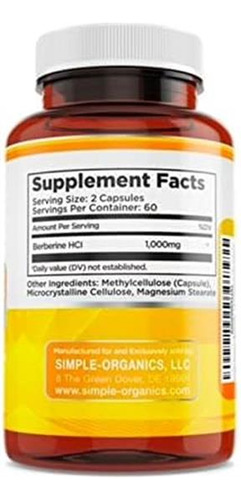 Na Simple-Organics, nos esforçamos para fornecer os produtos mais seguros e eficazes possíveis para ajudar os consumidores a levar estilos de vida saudáveis. Não comprometemos quando se trata de Saúde, Segurança e Qualidade e só adquirimos nossos ingredientes dos melhores fabricantes. Todos os nossos produtos são testados em laboratório quanto à pureza e segurança, juntamente com testes microbiológicos para garantir que todos os produtos Simple-Organic atendam a todas as especificações de qualidade. A berberina demonstrou apoiar uma longevidade saudável. A berberina também demonstrou ajudar a apoiar a saúde imunológica. Nossa Berberina contém 1000 mg de Berberina HCI por porção e 120 cápsulas por frasco. Absolutamente sem sabores artificiais ou produtos químicos de qualquer tipo. Temos orgulho de fabricar nossos suplementos nos Brasil em nossas instalações de fabricação que utilizam procedimentos e diretrizes rigorosos de Boas Práticas de Fabricação (GMP). *Este produto não se destina a diagnosticar, tratar, curar ou prevenir qualquer doença* A cor do frasco pode variar