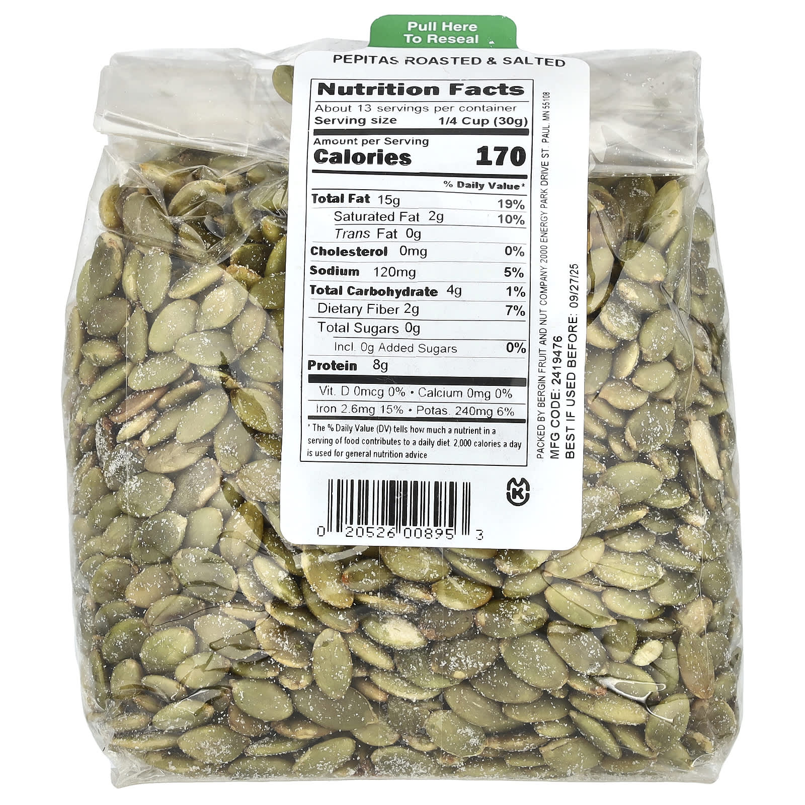 Bergin Fruit and Nut Company Pepitas Torrados e Salgados 397 g (14 oz) – Bergin Fruit and Nut Company Alimentos Petiscos e lanches Castanhas e sementes Sementes de abóbora e pepitas.