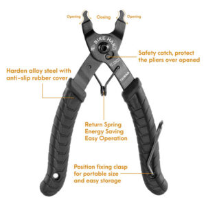 HANDY TOOL: BikeHand Tools Master Link Pliers are designed to help remove and replace master links in modern chain systems, although not needed when new. Over time, with dirt and corrosion, it is impossible to separate the joining link by hand. OPEN & CLOSE 2 IN 1 TOOL: Extremely easy to pull the link into its closed position. The pliers are also designed to open the master link which requires significant force for removal. Compatible with 5-12 Speed. NON SLIP: Rubber-coated handles ensure a soft non-slip grip. Quality spring would not fail even after years. HEAT TREATED: Heat treated high-quality steel constructed for a long time using. – HANDY TOOL: BikeHand Tools Master Link Pliers are designed to help remove and replace master links in modern chain systems, although not needed when new. Over time, with dirt and corrosion, it is impossible to separate the joining link by hand. – OPEN & CLOSE 2 IN 1 TOOL: Extremely easy to pull the link into its closed position. The pliers are also designed to open the master link which requires significant force for removal. Compatible with 5-12 Speed. – NON SLIP: Rubber-coated handles ensure a soft non-slip grip. Quality spring would not fail even after years. – HEAT TREATED: Heat treated high-quality steel constructed for a long time using. – ORDER NOW, WORRY-FREE! Were so confident about our product quality that we can provide a lifetime warranty! Made in Taiwan.