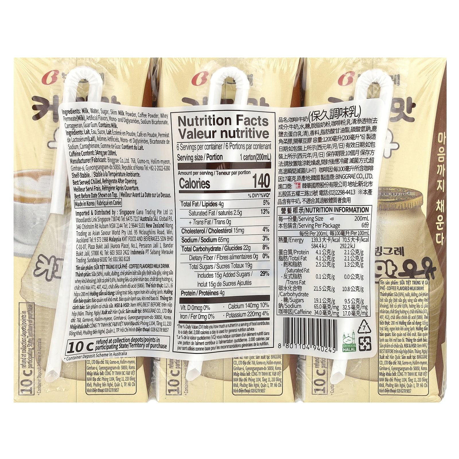 Binggrae Bebida Láctea com Sabor Café 6 Caixas 200 ml (68 fl oz) Cada – Binggrae Alimentos Chás e bebidas.