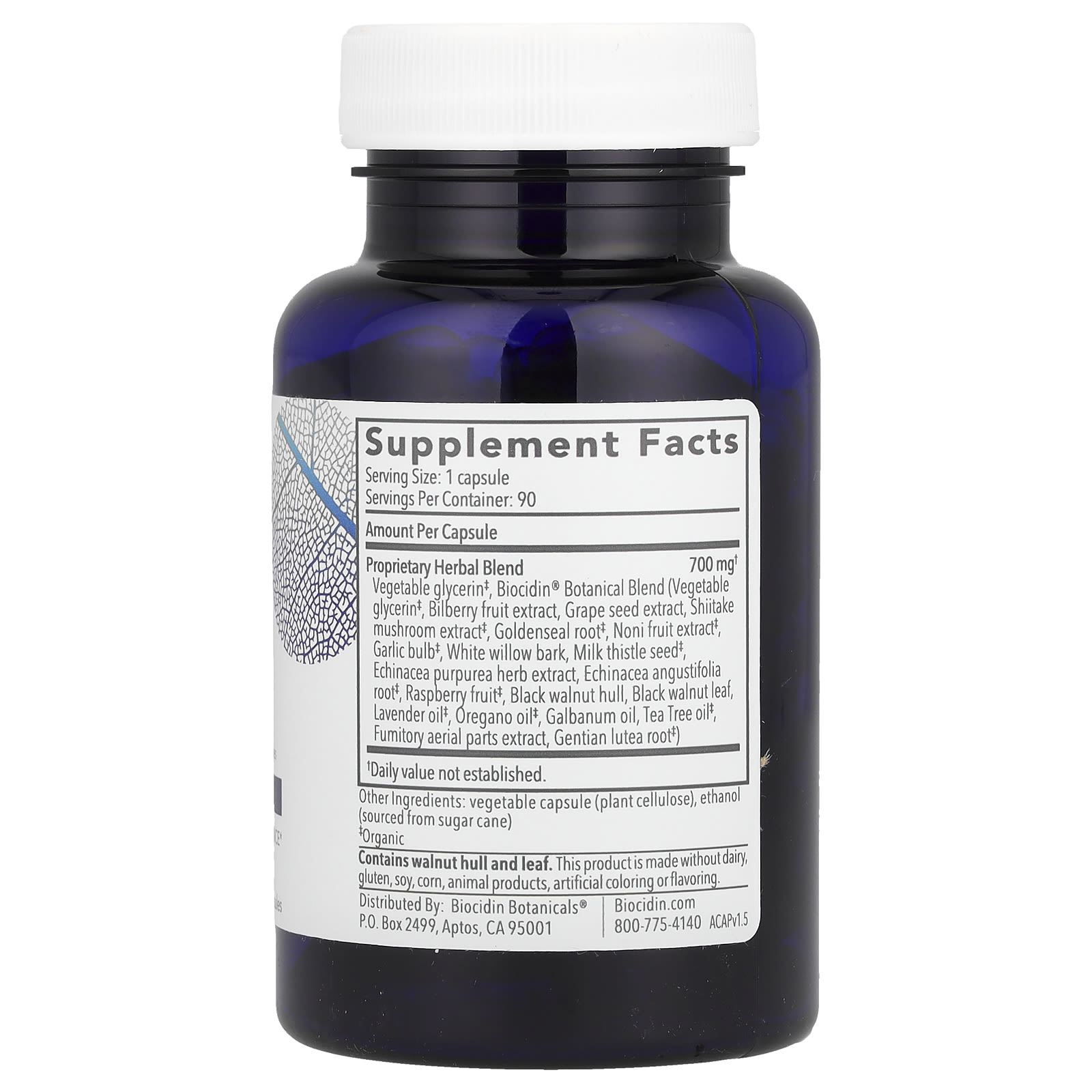 | Mistura de Ervas Patenteada Glicerina vegetal‡, Mistura Botânica Biocidin® (Glicerina vegetal‡, Extrato da fruta de Mirtilo Europeu, Extrato da semente de Uva, Extrato de cogumelo Shiitake‡, Raiz de Hidraste‡, Extrato da fruta Noni‡, Bulbo de alho‡, Casca de salgueiro branco, Semente de cardo-mariano‡, Echinacea purpurea extrato da erva, raiz de Echinacea angustifolia‡, fruta de Framboesa‡, Casca de nogueira-preta, folha de nogueira-preta, óleo de Lavanda‡, Óleo de Orégano‡, Óleo de Gábano, Óleo de Melaleuca‡, Extrato das partes aéreas fumitória, Raiz de Genciana lutea‡) |