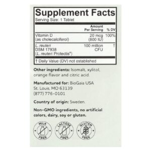 Os comprimidos Protectis® KIDS da BioGaia® Immune Active são um suplemento que contém a bactéria do ácido láctico patenteada Limosilactobacillus reuteri Protectis R (L. reuteri DSM 17938) e vitamina D3, que contribui para o funcionamento normal do sistema imunológico.