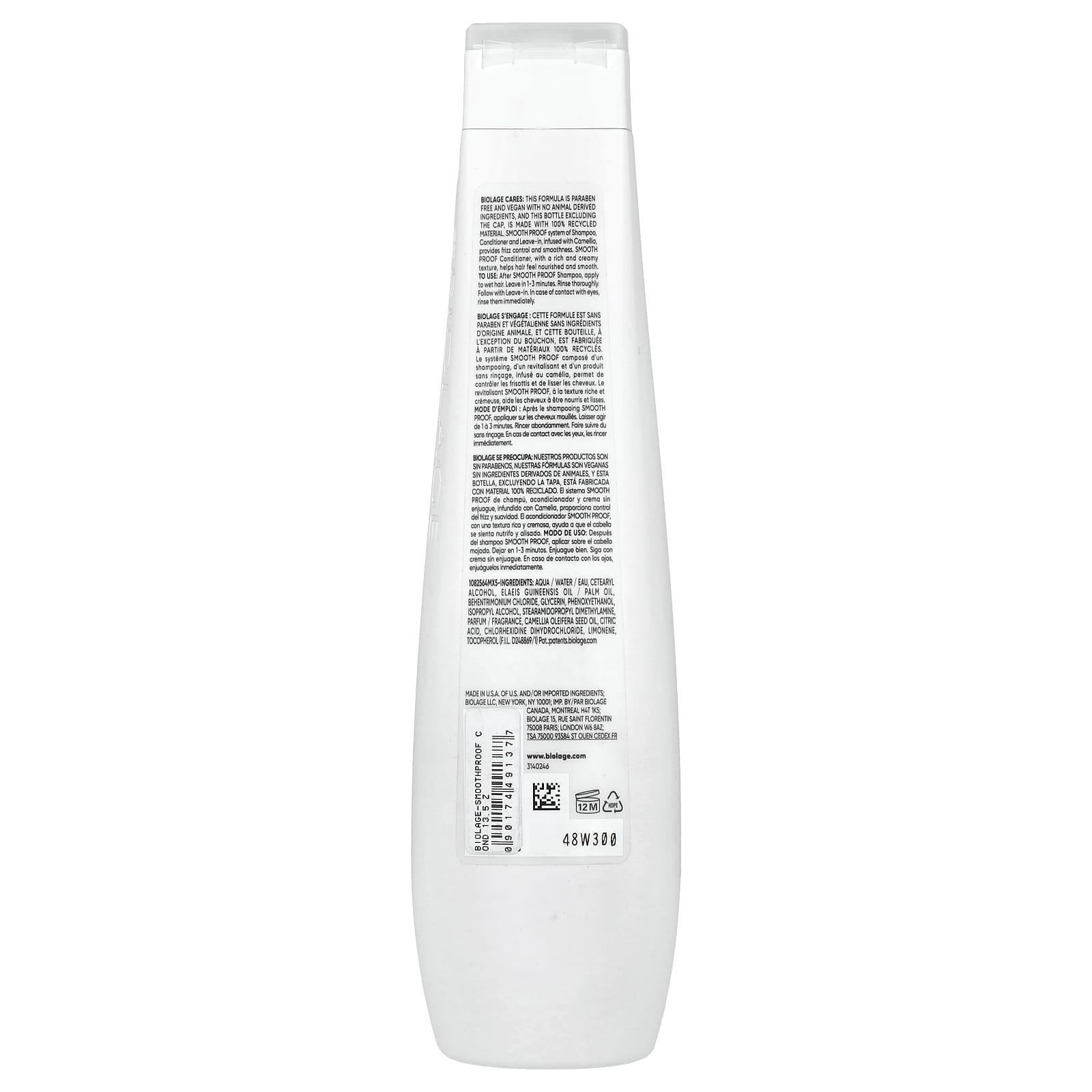 Biolage Cares: Esta fórmula é sem parabenos e vegana sem ingredientes derivados de animais. Além disso, este frasco, exceto a tampa, é feito com material 100% reciclado. O sistema Smooth Proof de Shampoo, Condicionador e Leave-in, com infusão de Camélia, proporciona controle do frizz e suavidade. O Condicionador Smooth Proof, com uma textura nutritiva e cremosa, ajuda a deixar o cabelo nutrido e macio.