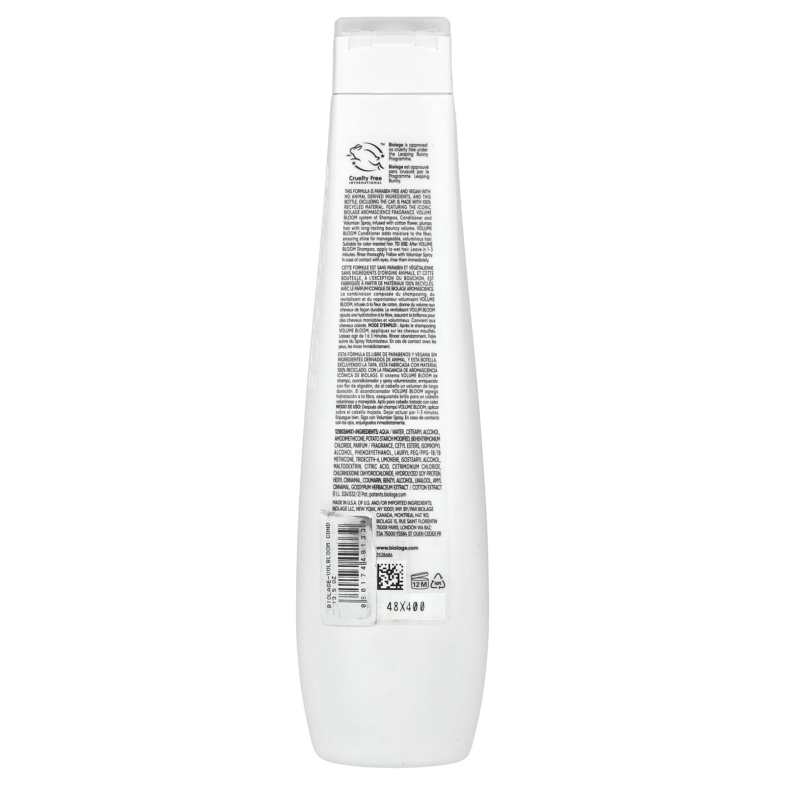 Esta fórmula é sem parabenos e vegana sem ingredientes derivados de animais. Além disso, este frasco, exceto a tampa, é feito com material 100% reciclado. Com a icônica fragrância Biolage Aromascience. O sistema Volume Flower de Shampoo, Condicionador e Spray Volumizador, infundido com flor de algodão, revitaliza o cabelo e proporciona um volume flexível e duradouro. O Condicionador Volume Flower adiciona hidratação à fibra, garantindo brilho para cabelos controláveis e volumosos.