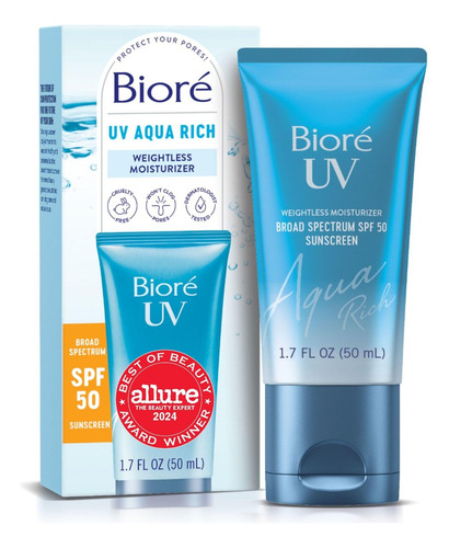 Hidratante diário Bioré UV Aqua Rich SPF 50 Protetor solar e primer de maquiagem sem óleo com ácido hialurônico, sem gesso branco, não comedogênico, para peles sensíveis, PA ++++, 50 ml DESCRIÇÃO: HIDRATA. PROTEGE. PERMANECE INVISÍVEL. Biore UV Aqua Rich é um hidratante diário 3 em 1 com FPS 50 e primer de maquiagem que hidrata e protege o rosto dos raios UV sem obstruir os poros ou deixar uma sensação pesada. Enriquecido com ácido hialurônico, uma estrela do cuidado da pele conhecida por seu poder hidratante, para hidratação visível durante todo o dia. O hidratante Biore Aqua Rich com protetor solar SPF 50 é absorvido instantaneamente e desaparece em todos os tons de pele sem deixar um tom branco. Ele é desenvolvido a partir dos protetores solares à base de água da Biore Japan, icônicos por suas texturas leves e proteção invisível. Este hidratante UVA e UVB com FPS 50 de amplo espectro é ultraleve, se espalha facilmente e é absorvido instantaneamente para hidratar e ajudar a proteger contra os raios UV. Formulado por especialistas para fornecer proteção leve e respirável, esse protetor solar facial testado por dermatologistas não contém oxibenzona e octinoxato e é formulado para todos os tipos de pele, incluindo peles sensíveis. Este protetor solar facial sem óleo e não comedogênico funciona como primer sob a base, hidratando e suavizando a pele, evitando bolinhas e estrias. Além disso, você está cuidando do planeta enquanto cuida dos seus poros.