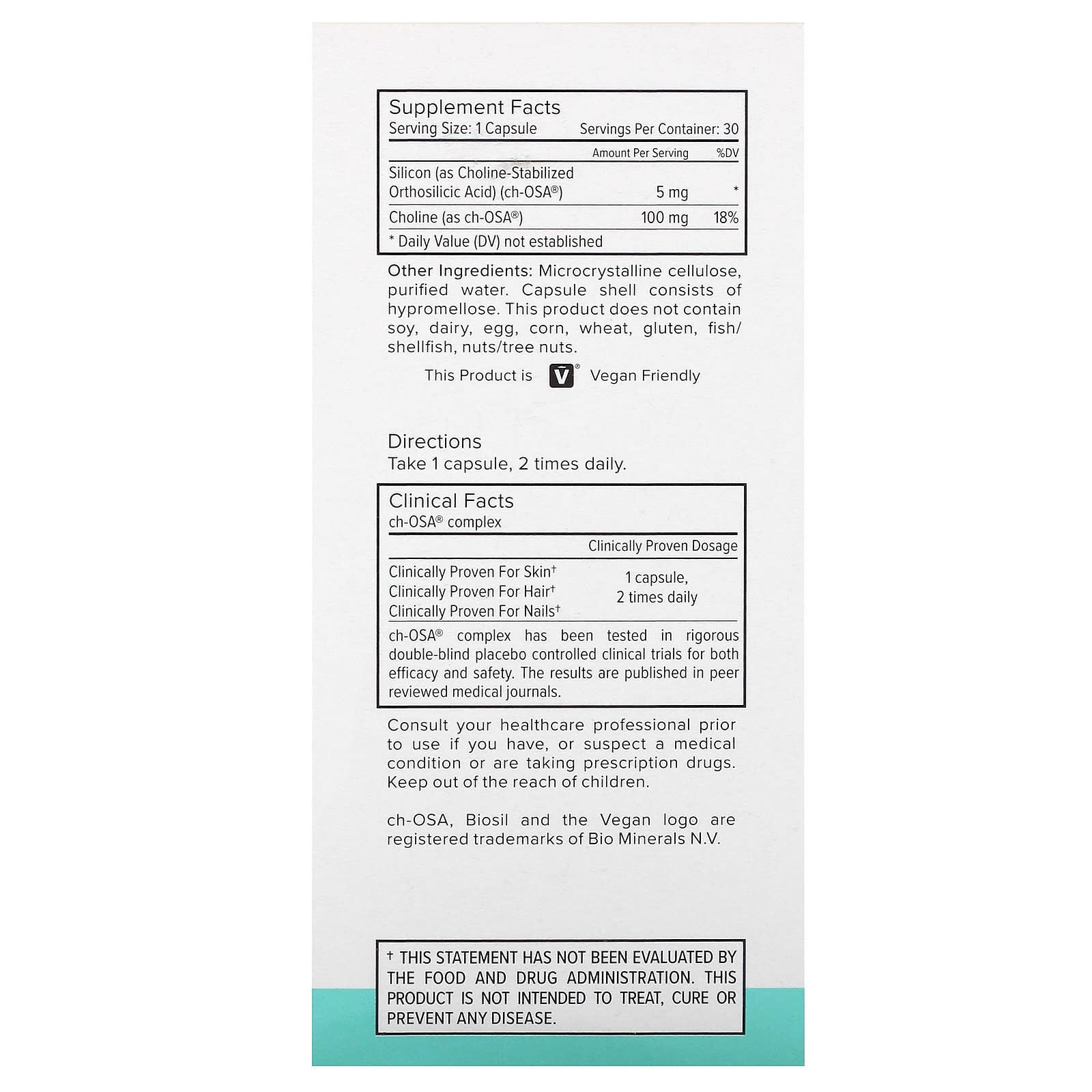 | Dióxido de Silício (como Ácido Ortossilícico Estabilizado por Colina, ch-OSA®) | 5 mg | * |