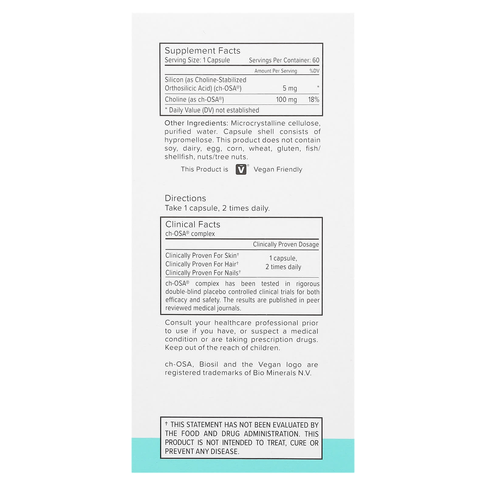 | Dióxido de Silício (como Choline-Stabilized Orthosilicic Acid, ch-OSA®) | 5 mg | * |