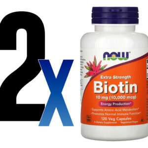 Biotina 10mg Extra Força Now Foods 120Veg Caps é uma vitamina essencial para o crescimento normal e funções corporais. Atua como um regulador chave na síntese de ácidos graxos e no metabolismo de alguns aminoácidos. Contribui para a produção de energia e aumenta a síntese de certas proteínas, desempenhando um papel fundamental para o bem-estar da pele. Contém Farinha de Arroz, Hipromelose (cápsula de celulose), Dióxido de Silício e Ácido Esteárico (fonte vegetal). Não contém trigo, glúten, soja, milho, leite, ovo, peixe, marisco ou ingredientes de nozes. Recomenda-se tomar 1 cápsula por dia com uma refeição. Apenas para adultos. Consulte um profissional de saúde antes de usar este produto se estiver grávida ou amamentando. Mantenha fora do alcance de crianças. Armazenar em local seco e fresco após a abertura. Pode ocorrer variação natural da cor neste produto. Conteúdo do frasco: 120 Cápsulas Vegetarianas.