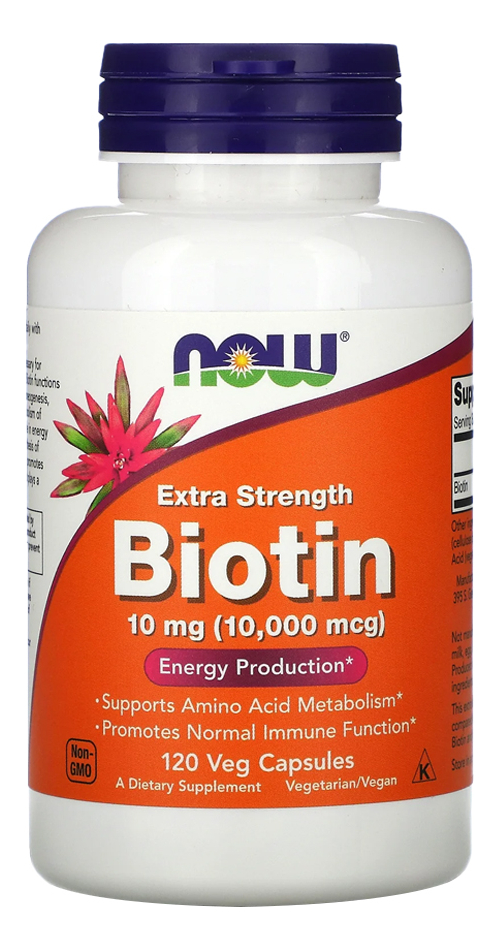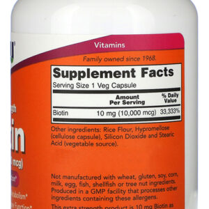 Biotina 10mg Extra Força Now Foods 120Veg Caps A biotina Extra Força da Now Foods, disponível em cápsulas vegetarianas de 10mg é uma vitamina indispensável para o crescimento normal e funções corporais. Apresenta suporte para funcionar como um elemento regulador chave na síntese de ácidos graxos e no metabolismo de alguns aminoácidos. Atua na produção de energia e aumentando a síntese de certas proteínas e desempenha um papel fundamental para o bem-estar da pele. Outros ingredientes: Farinha de Arroz, Hipromelose (cápsula de celulose), Dióxido de Silício e Ácido Esteárico (fonte vegetal). fabricado sem trigo, glúten, soja, milho, leite, ovo, peixe, marisco ou ingredientes de nozes. Recomendações de uso: Tome 1 cápsula por dia com uma refeição. Cuidados: Apenas para adultos. Busque orientação antes de utilizar este produto se estiver grávida ou amamentando. Mantenha fora do alcance de crianças. Armazenamento: Armazenar em local seco e fresco após a abertura. Pode ocorrer variação natural da cor neste produto. Conteúdo do frasco: 120 Cápsulas Vegetarianas VIDE VALIDADE