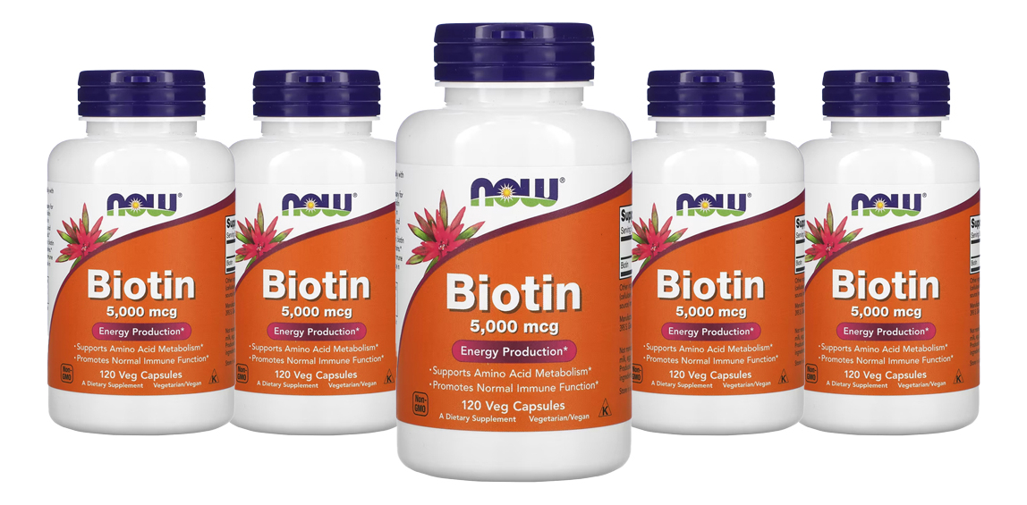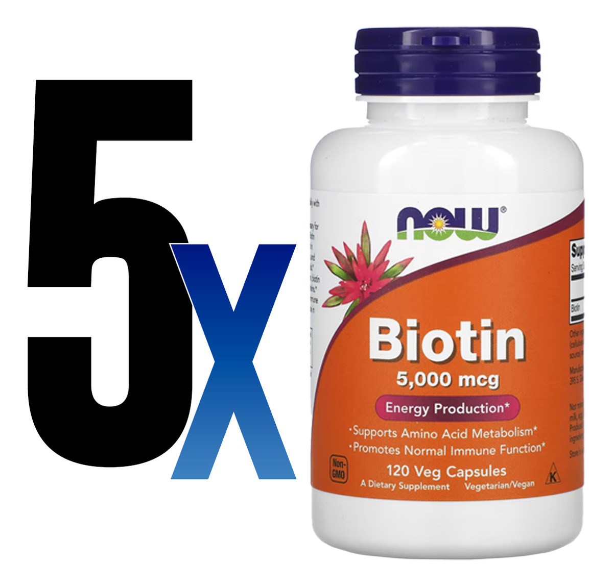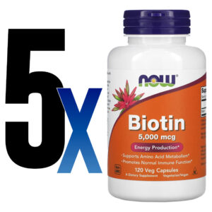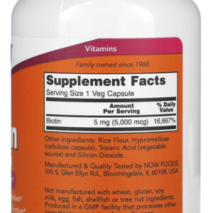 Biotina 5000mcg Now Foods 120Veg Caps A biotina da Now Foods, disponível em cápsulas vegetarianas de 5000mg é uma vitamina indispensável para o crescimento normal e funções corporais. Apresenta suporte para funcionar como um elemento regulador chave na síntese de ácidos graxos e no metabolismo de alguns aminoácidos. Além de atuar na produção de energia, aumentando a síntese de certas proteínas e desempenhando um papel fundamental para o bem-estar de sua pele. Outros ingredientes: Farinha de Arroz, Hipromelose (cápsula de celulose), Dióxido de Silício e Ácido Esteárico (fonte vegetal). fabricado sem trigo, glúten, soja, milho, leite, ovo, peixe, marisco ou ingredientes de nozes. Recomendações de uso: Tome 1 cápsula por dia com uma refeição. Cuidados: Apenas para adultos. Busque orientação antes de utilizar este produto se estiver grávida ou amamentando. Mantenha fora do alcance de crianças. Armazenamento: Armazenar em local seco e fresco após a abertura. Pode ocorrer variação natural da cor neste produto. Conteúdo do frasco: 120 Cápsulas Vegetarianas VIDE VALIDADE