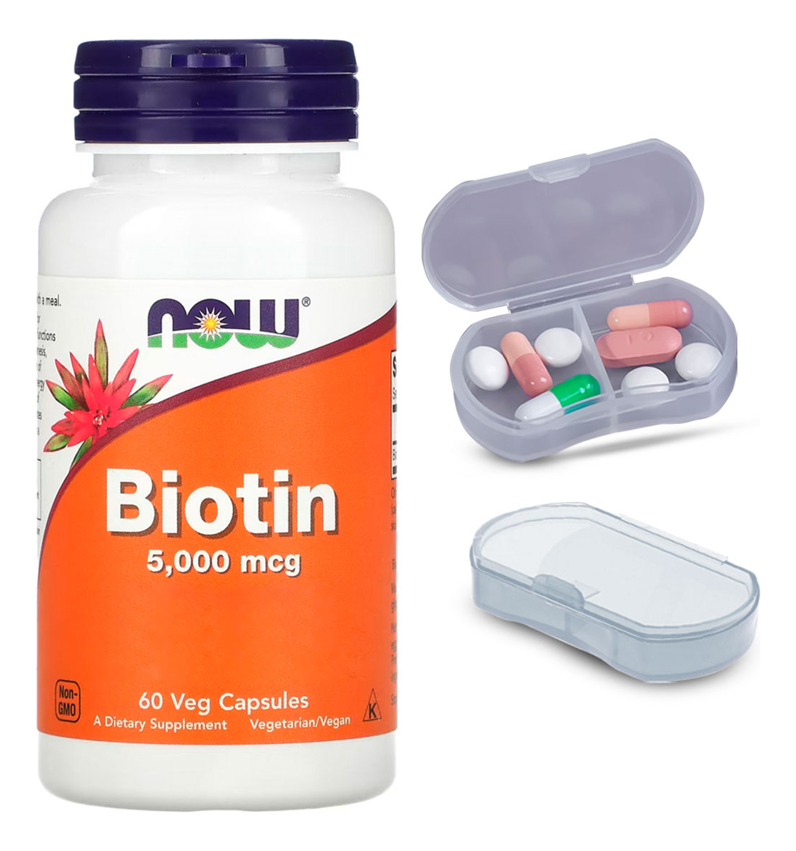 Kit Biotina 5000mcg Now Foods 60 Caps + Porta Cápsulas Fortalecimento Capilar e Unhas: Experimente o poder do fortalecimento capilar e de unhas com a Biotina 5000mcg da Now Foods. Sua fórmula avançada promove uma aparência mais forte e saudável, ajudando no cuidado com sua aparência pessoal. Formato Prático e Vegano: As cápsulas vegetais são fáceis de engolir e perfeitas para quem segue uma dieta vegana. A embalagem com 60 cápsulas oferece um suprimento conveniente, ideal para manter sua rotina de cuidados pessoais. Qualidade Internacional a Seu Alcance: Este produto importado da Now Foods traz a garantia de qualidade internacional diretamente para você. Disponível para pronta entrega, você não precisa esperar para começar a cuidar de si mesmo com o melhor que a natureza tem a oferecer. Porta Cápsulas com Duas Repartições: O kit também inclui um porta-cápsulas prático, dividido em duas seções internas. Isso permite uma organização eficaz e separada de diferentes tipos de cápsulas ou pílulas. Composição Natural e Confiável: A Biotina 5000mcg da Now Foods é composta por ingredientes naturais e seguros, sem aditivos artificiais. A formulação respeita seu corpo e o meio ambiente, garantindo uma escolha consciente para o seu bem-estar. VALIDADE LONGA