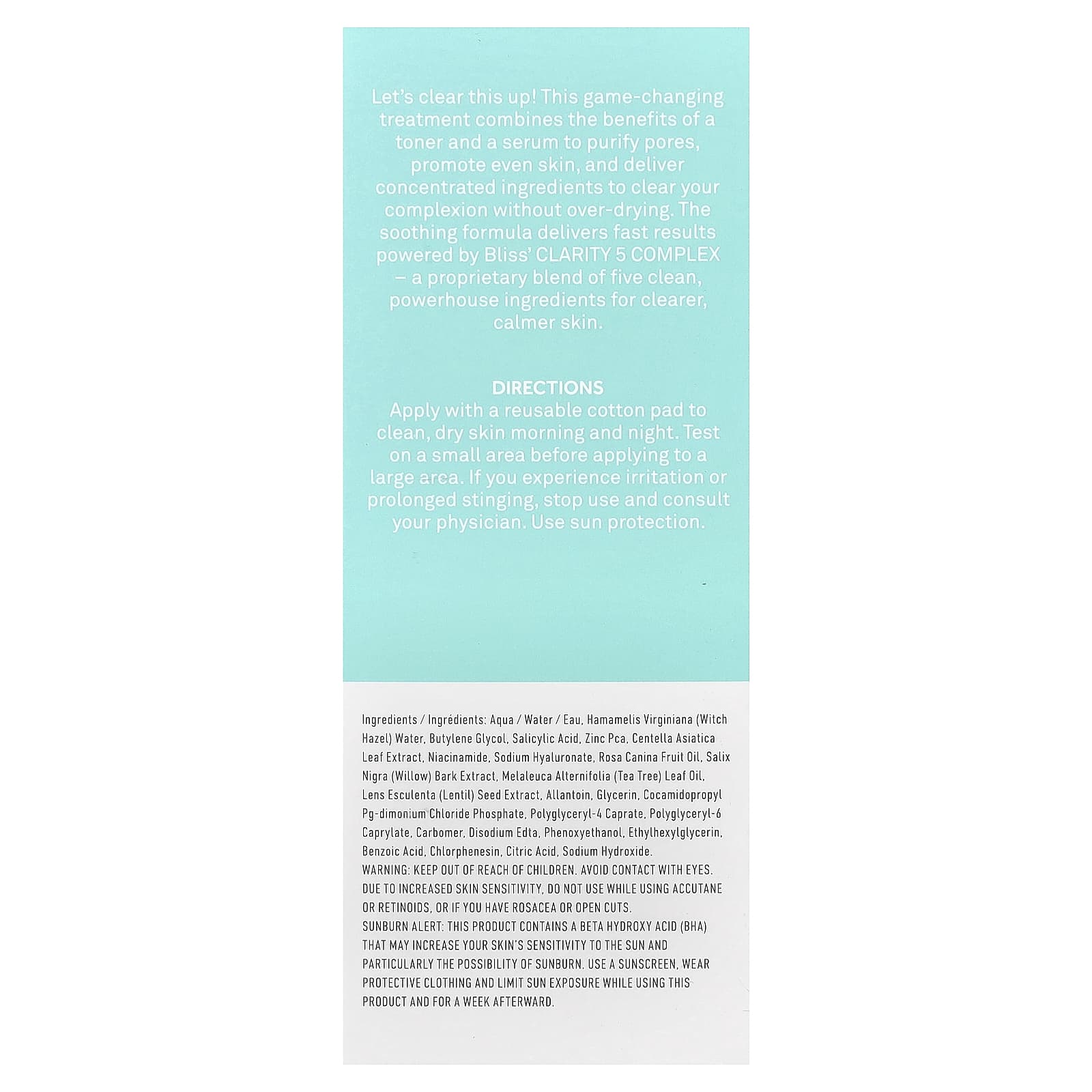 Vamos esclarecer isso! Este tratamento revolucionário combina os benefícios de um tônico e um sérum para purificar os poros, promover uma pele uniforme e fornecer ingredientes concentrados para limpar sua tez sem ressecar demais. A fórmula calmante oferece resultados rápidos com o Complexo Clarity 5 da Bliss, uma mistura patenteada de cinco ingredientes puros e poderosos para uma pele mais clara e calma.