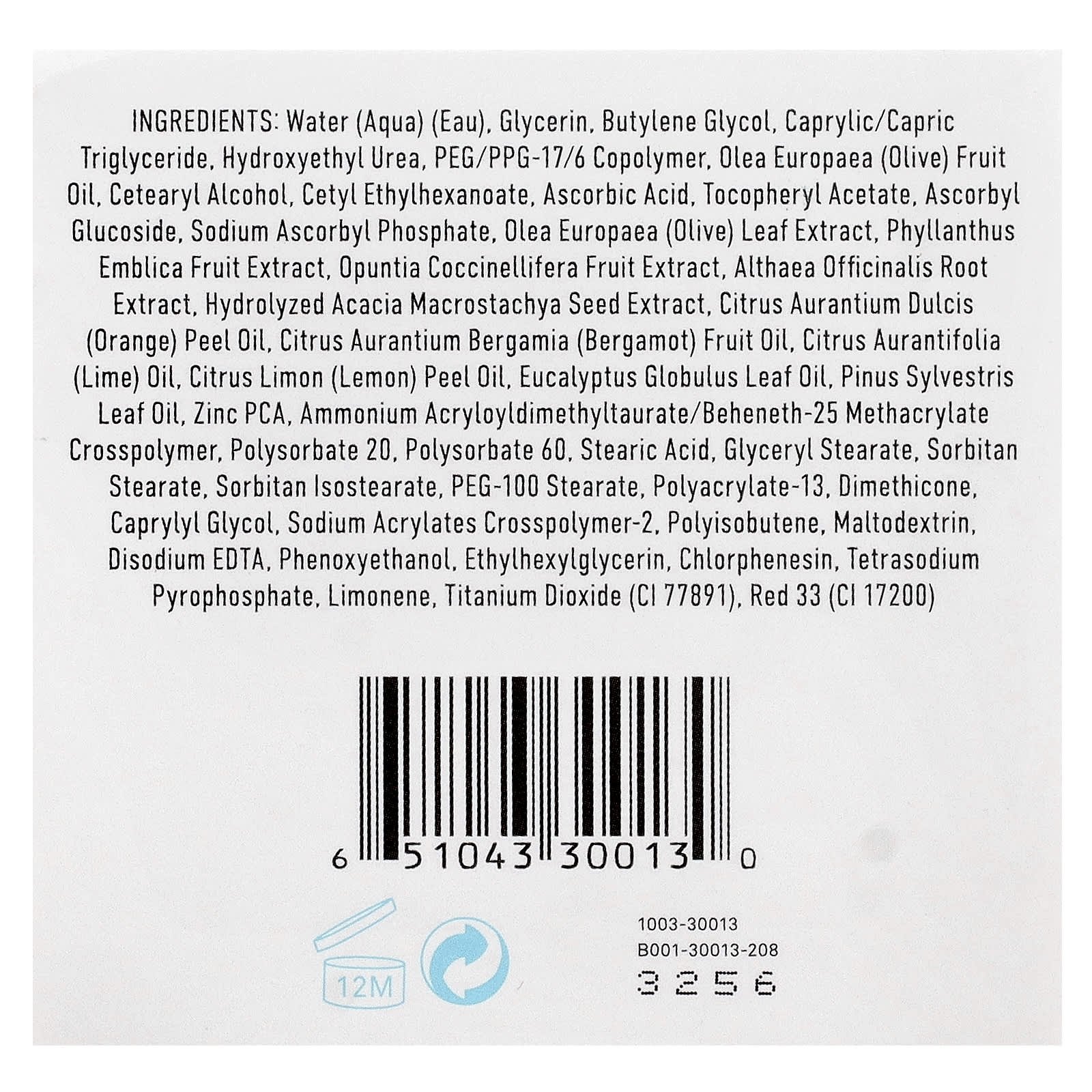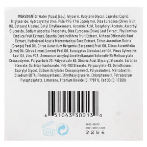 Água, glicerina, butilenoglicol, caprylic/capric triglyceride, hydroxyethyl urea, peg/ppg-17/6 copolymer, óleo da fruta de Olea europaea (azeitona), álcool cetoestearílico, etilcaproato de cetila, ácido ascórbico, acetato de tocoferol, ascorbyl glucoside, sodium ascorbyl phosphate, extrato da folha de Olea europaea (azeitona), extrato da fruta de Phyllanthus emblica, extrato da fruta de Opuntia coccinellifera, extrato da raiz de Althaea officinalis, extrato da semente de Acacia macrostachya hidrolisada, óleo da casca de Citrus aurantium dulcis (laranja), óleo da fruta de Citrus aurantium bergamia (bergamota), óleo de Citrus aurantifolia (limão-taiti), óleo da casca de Citrus limon (limão), óleo da folha de Eucalypto globulus, óleo da folha de Pinus sylvestris, zinco pca, ammonium acryloyldimethyltaurate/beheneth-25 methacrylate crosspolymer, polissorbato 20, polissorbato 60, ácido esteárico, monoestearato de glicerila, estearato de sorbitana, isoestearato de sorbitana, estearato de PEG-100, polyacrylate-13, dimeticona, caprylyl glycol, sodium acrylates crosspolymer-2, poli-isobutileno, maltodextrina, edetato dissódico, fenoxietanol, ethylhexylglycerin, clorfenesina, pirofosfato de tetrassódio, limoneno. Pode conter (+/-): Dióxido de titânio (CI 77891), vermelho 33 (CI 17200).