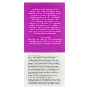 Saia à frente! Mantenha a pele jovem e restaure visivelmente a elasticidade da pele com este sérum superpotente criado para proteger contra os sinais de envelhecimento e, ao mesmo tempo, reduzir (e prevenir!) o aparecimento de linhas de expressão. Esta fórmula renovadora da juventude oferece uma tez saudável, suave e radiante, desenvolvida com retinol puro e complexo PREVINE-4: a mistura de aminoácidos para reabastecer que protege contra o envelhecimento, peptídeos para ajudar a suavizar, esqualano para hidratar e antioxidantes para proteger a pele .