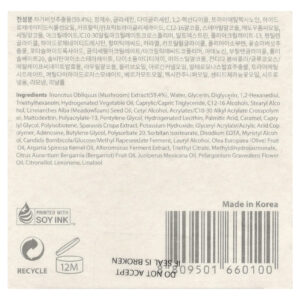extrato de Inonotus obliquus (cogumelo) (59,4%), água, glicerina, diacilglicerol, 1,2-hexanediol, triethylhexanoin, óleo vegetal hidrogenado, caprylic/capric triglyceride, c12-16 alcohols, álcool estearílico, óleo da semente de Limnanthes alba (meadowfoam), álcool cetílico, acrylates/c10-30 alkyl acrylate crosspolymer, maltodextrina, polyacrylate-13, pentilenoglicol, lecitina hidrogenada, ácido palmítico, caramelo, caprylyl glycol, poli-isobutileno, extrato de Sparassis crispa, hidróxido de potássio, glyceryl acrylate/acrylic acid copolymer, adenosina, butilenoglicol, polissorbato 20, isoestearato de sorbitana, edetato dissódico, álcool miristílico, fermento de Candida bombicola/glicose/methyl rapeseedate, lauryl alcohol, óleo da fruta de Olea europaea (azeitona), óleo do grão de Argania spinosa, extrato da fermentação de Alteromonas, citrato de trietila, methyldihydrojasmonate, óleo da fruta de Citrus aurantium bergamia (bergamota), óleo de Juniperus mexicana, óleo da flor de Pelargonium graveolens, citronelol, limoneno, linalool.