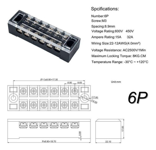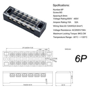 Número: 6P Parafuso: M3 Espaçamento: 8,9 mm Classificação de tensão: 600V 450V Classificação de amplificador: 15A 32A Tamanho do fio: 22-12AWG (4,0mm²) Resistência à tensão: AC2500V/1 min Toque máximo de bloqueio: 8KG.CM Faixa de temperatura: -30° C-+120°C