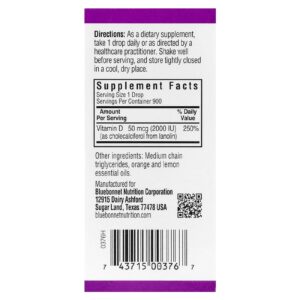 As Gotas de Vitamina D3 Líquida 50 mcg (2000 UI) da Bluebonnet são formuladas com vitamina D3 (colecalciferol) de lanolina que contribui para ossos e funções imunológicas fortes e saudáveis. Cada gota desta vitamina solar é aromatizada com um toque delicioso de óleos essenciais de laranja e limão.