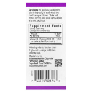 As Gotas de Vitamina D3 Líquida 25 mcg (1000 UI) da Bluebonnet são formuladas com vitamina D3 (colecalciferol) de lanolina que contribui para ossos e funções imunológicas fortes e saudáveis. Cada gota desta vitamina solar é aromatizada com um toque delicioso de óleos essenciais de laranja e limão.