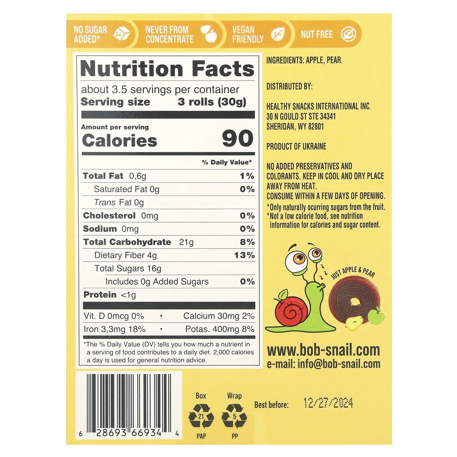 Bob Snail Rolos de Frutas Maçã-Pera 10 Sachês 10 g (035 oz) Cada – Bob Snail Alimentos Petiscos e lanches Snacks de frutas e vegetais.