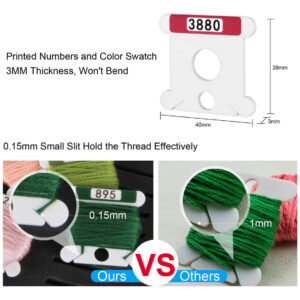 Mantenha sua linha de bordar bem organizada com as bobinas de fio dental para bordar acrílico Hamtery White de 3 mm. Este conjunto de 500 bobinas foi projetado para os entusiastas do bordado moderno que valorizam a conveniência e a durabilidade. Números impressos e números de amostra de cores são impressos diretamente em cada bobina junto com uma amostra de cor exclusiva, eliminando a frustração de adesivos caírem. Dicas quentes: fazemos o possível para combinar as cores, mas existem diferenças nos lotes de tinta da linha, então nem sempre funciona perfeitamente. Uma pequena fenda de 0,15 mm, a linha de bordar não cai. Ao contrário das bobinas de fenda de 1 mm disponíveis no mercado, nossas bobinas têm fendas cortadas a laser que medem aproximadamente 0,15 mm de largura. Isso permite que a linha de bordar seja segurada com segurança sem se desfazer. 3 mm de espessura, mais grossas que as bobinas de plástico no mercado. As bobinas são feitas de acrílico fundido de qualidade com 3 mm de espessura e são mais grossas do que as bobinas de plástico no mercado. Isso reduz o enrugamento dos primeiros fios enrolados na bobina e eles não se dobram quando você coloca um novelo inteiro de fio dental sobre eles. Compatibilidade versátil Inclui 5 inserções de espuma (opções disponíveis) compatíveis com Bisley, Durable Varicolor, DMC Vintage (excluindo a versão pequena) e mais gabinetes. Para todas as suas necessidades de armazenamento de linhas de ponto cruz, essas bobinas oferecem funcionalidade e variedade. Presente ideal para entusiastas do bordado e costureiros. Com as bobinas de fio dental para bordar acrílico Hamtery White de 3 mm, dê adeus aos fios emaranhados e olá à organização criativa. Para seu próximo projeto, mantenha suas linhas de ponto cruz bem organizadas e de fácil acesso. Para costureiros e entusiastas do bordado, este conjunto de 500 porta-linhas de bordar acrílico é o presente ideal. – Dicas quentes: o número 504 é substituído por 3813, 731 é substituído por 732, 776 é substituído por 3326, 781 é substituído por 782, 971 é substituído por 740, 806 é substituído por 3760, 868 é substituído por 801. – Conjunto de 500 bordados em acrílico Bobinas de fio dental – são compostas pelas 500 cores sólidas atuais, incluindo as bobinas descontinuadas 3773 e 16 bobinas entre 3880 e 3895. Perfeitas para manter a linha de bordar organizada e armazenada. (Dicas quentes: cada bobina tem uma película protetora na parte traseira, mas é melhor removê-la antes de usar. Deixá-la ligada não danificará as bobinas.) – Chega de lidar com a queda de adesivos – Com números impressos e uma amostra de cores diretamente nas bobinas, você pode se despedir da frustração de adesivos caindo, garantindo fácil identificação e eliminando a frustração. (Dicas quentes: fazemos o possível para combinar cores, mas existem diferenças nos lotes de tinta da linha, então nem sempre funciona perfeitamente.) – Robusta e moderna – Nossa bobina de fio dental bordado de acrílico branco tem 3 mm de espessura, é resistente e esteticamente agradável, em contraste com as bobinas de plástico e papelão disponíveis no mercado. Você não precisa mais se preocupar com o fato de seu fio dental de ponto cruz ficar bagunçado devido à quebra ou ondulação das bobinas. – Fenda pequena (0,15 mm) segure a linha de forma eficaz – A maioria dos porta-linhas de bordado disponíveis no mercado tem fendas de 1 mm de largura. Devido à largura excessiva dessa fenda, a linha de bordar cai. Nossas bobinas incluem fendas cortadas a laser com aproximadamente 0,15 mm de largura, o que as torna adequadas para segurar a linha de bordar e evitar que se soltem. – Organize com facilidade – Nossas bobinas de fio dental de acrílico branco têm 40 mm (largura) x 38 mm (altura) e cada uma pode acomodar um novelo inteiro de linha de bordar. O organizador de fio dental para bordar oferece adaptabilidade e praticidade para todas as suas necessidades de armazenamento de linhas de ponto cruz com as inserções de espuma (opções disponíveis). Eles são compatíveis com Bisley, DMC Vintage (exceto a versão pequena), Durable Varicolor e mais armários de armazenamento.