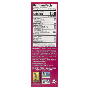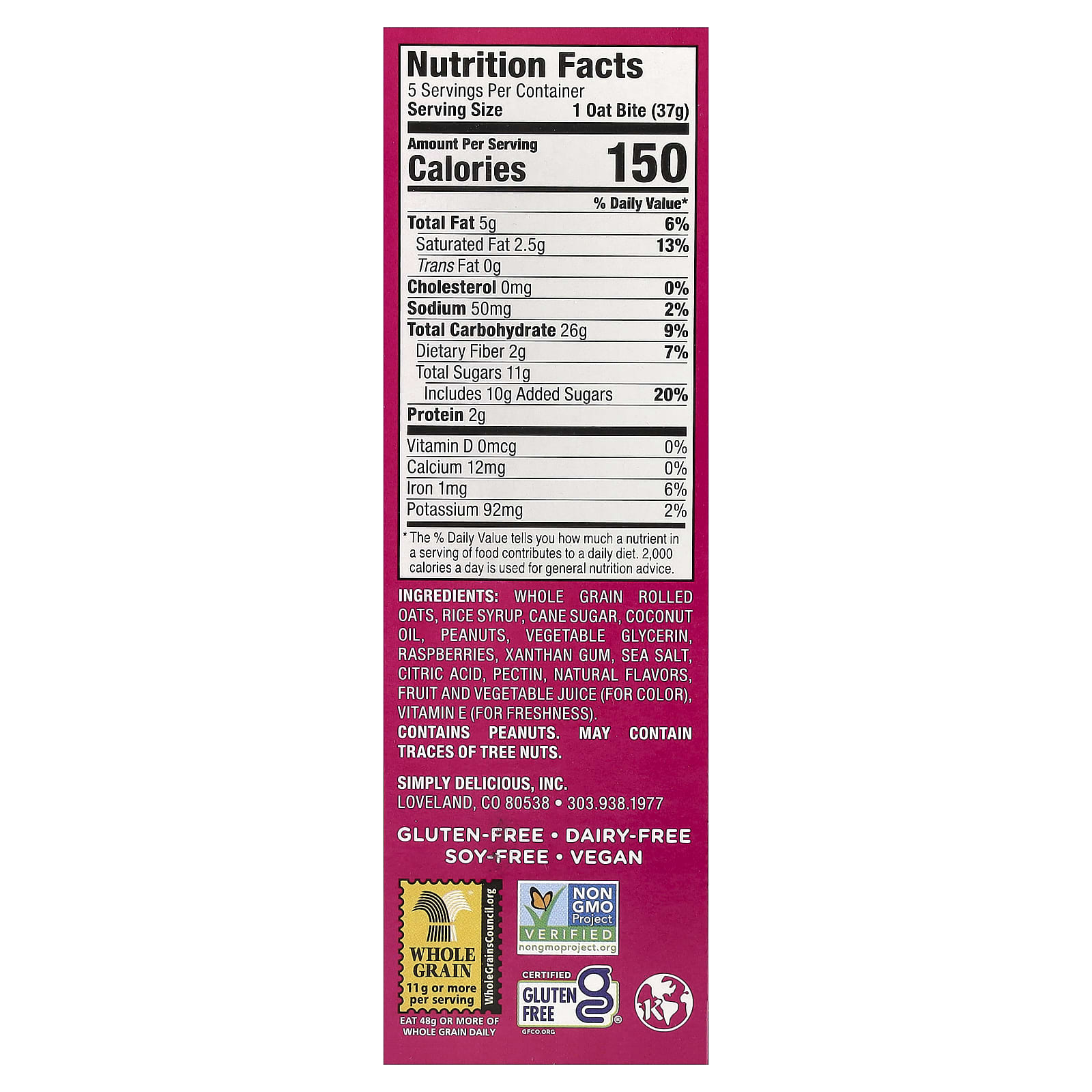 Aveia em flocos integral, xarope de arroz, açúcar de cana, óleo de coco, Amendoins, glicerina vegetal, framboesas, goma xantana, sal marinho, ácido cítrico, pectina, Sabores naturais, suco de frutas e vegetais (corante), vitamina E (para dar frescor).