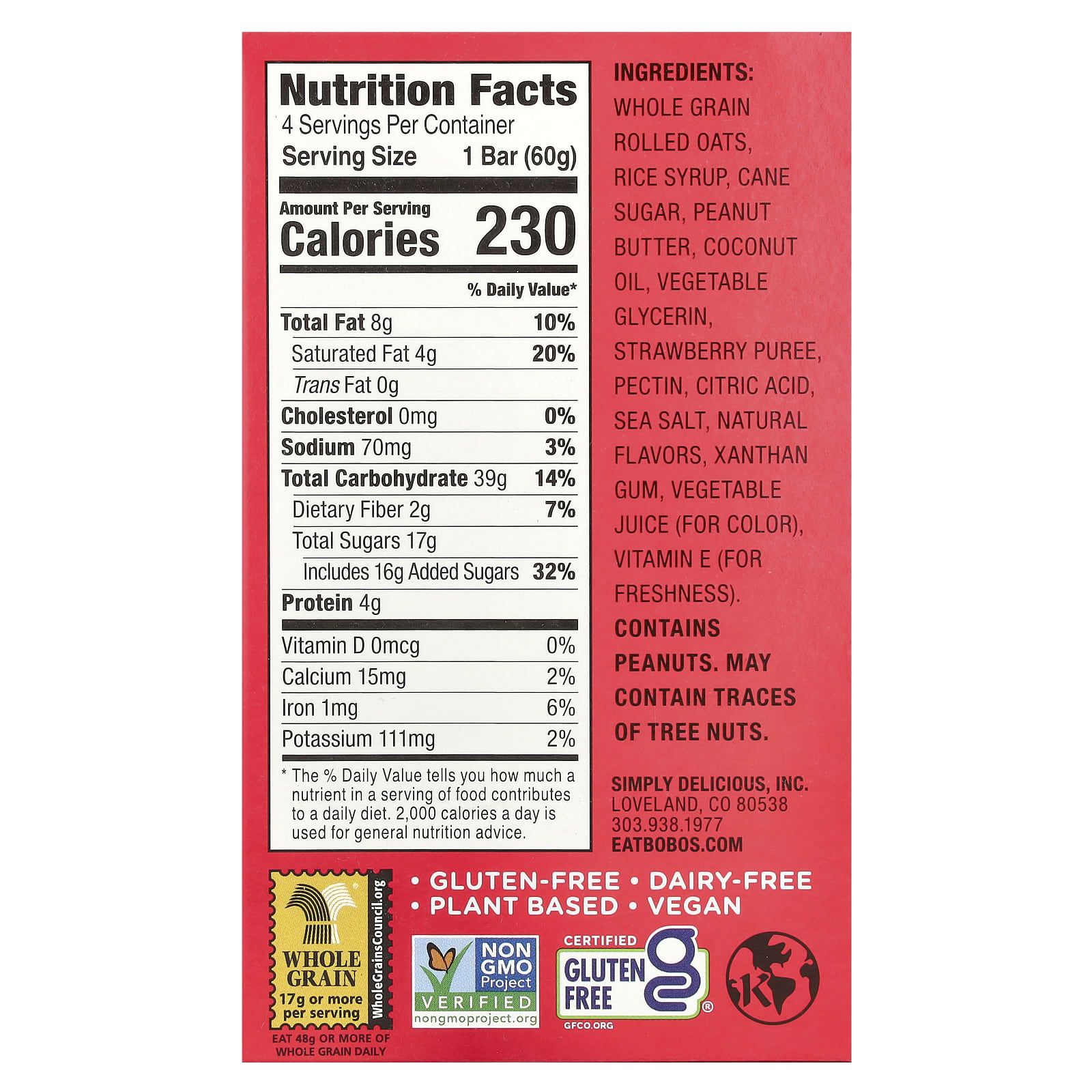 Aveia em Flocos com grãos integrais, xarope de arroz, açúcar de cana-de-açúcar, manteiga de amendoim, óleo de coco, glicerina vegetal, purê de morango, pectina, ácido cítrico, sal marinho, sabores naturais, goma xantana, suco de vegetais (para dar cor), vitamina E (para frescor).