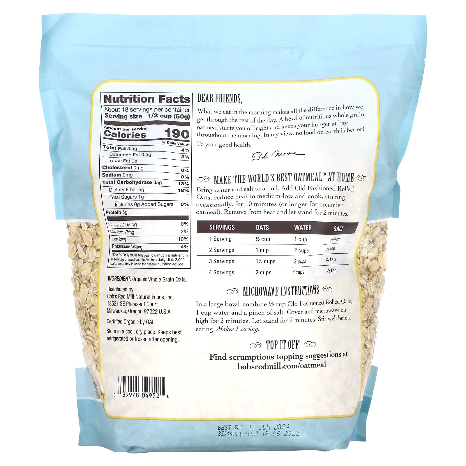 Bobs Red Mill Aveia em flocos Orgânica Antiquada Grãos Integrais 907 g (32 oz) – Bob’s Red Mill Alimentos Cereais e alimentos para café da manhã Aveia Cereais quentes.