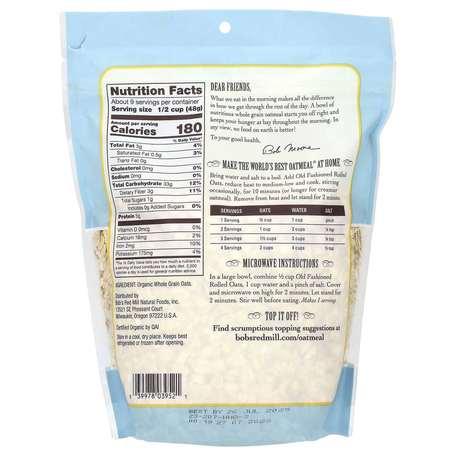 Bobs Red Mill Aveia em Flocos Tradicional Orgânica Integral 454 g (16 oz) – Bob’s Red Mill Alimentos Cereais e alimentos para café da manhã Aveia Cereais quentes.