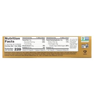 Amendoim, aveia em grão integral, xarope de tapioca orgânica, pedaços de chocolate orgânico (açúcar de cana orgânico, licor de chocolate orgânico, manteiga de cacau orgânica, baunilha orgânica em pó), mel orgânico, cacau (processado com álcali), sal marinho, extrato de alecrim orgânico (para preservar o frescor).