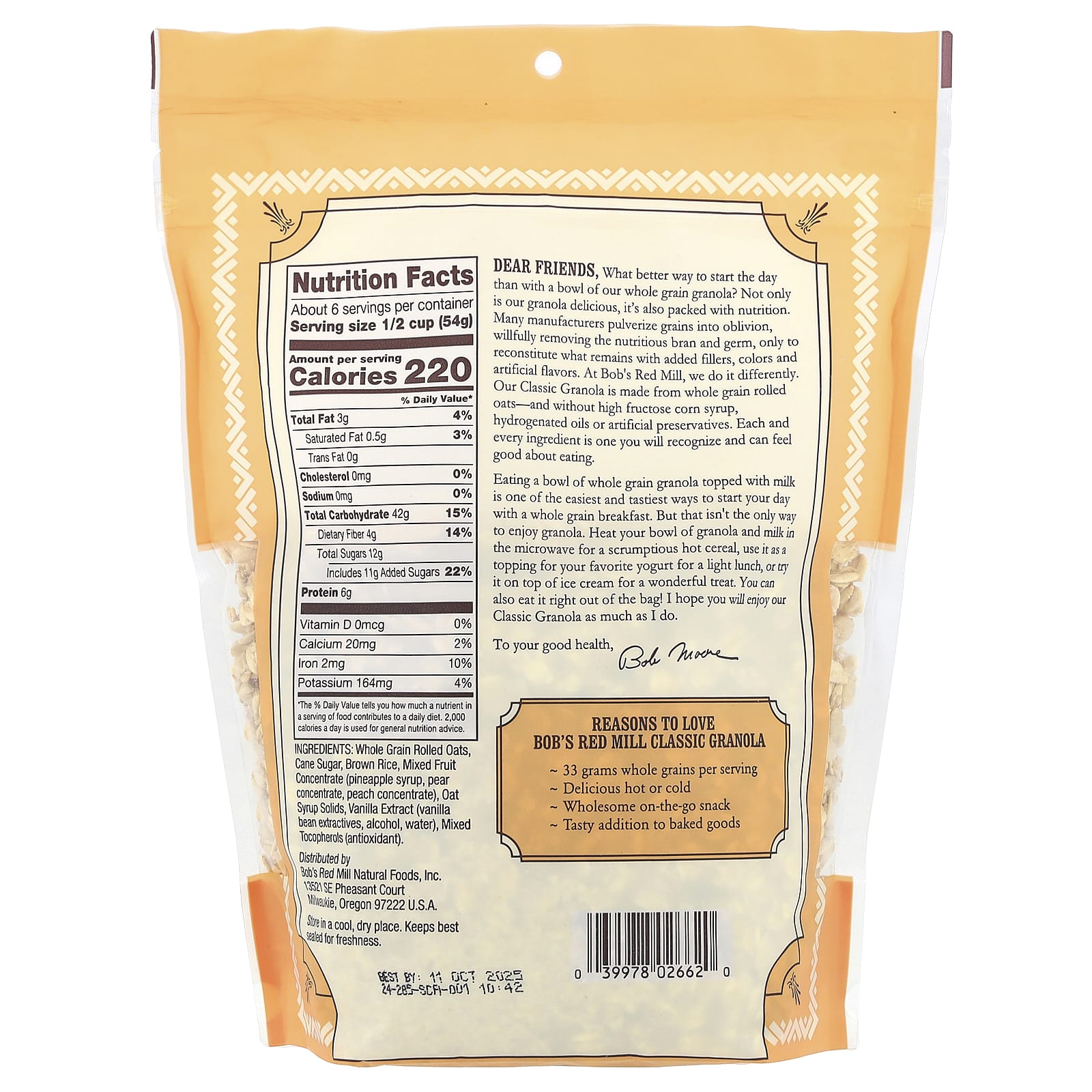 Caros amigos, Que melhor maneira de começar o dia do que com uma tigela de nossa granola com grãos integrais? Além de deliciosa, nossa granola é repleta de nutrição. Muitos fabricantes pulverizam os grãos até o fim, removendo intencionalmente o farelo nutritivo e o germe, apenas para reconstituir o que permanece com a adição de excipientes, corantes e sabores artificiais. Na Bob’s Red Mill, fazemos isso de maneira diferente. Nossa Granola Clássica é feita com grãos de aveia integrais e sem xarope de milho com alto teor de frutose, óleos hidrogenados ou conservantes artificiais. Cada ingrediente que você reconhecerá e poderá se sentir bem ao comer.