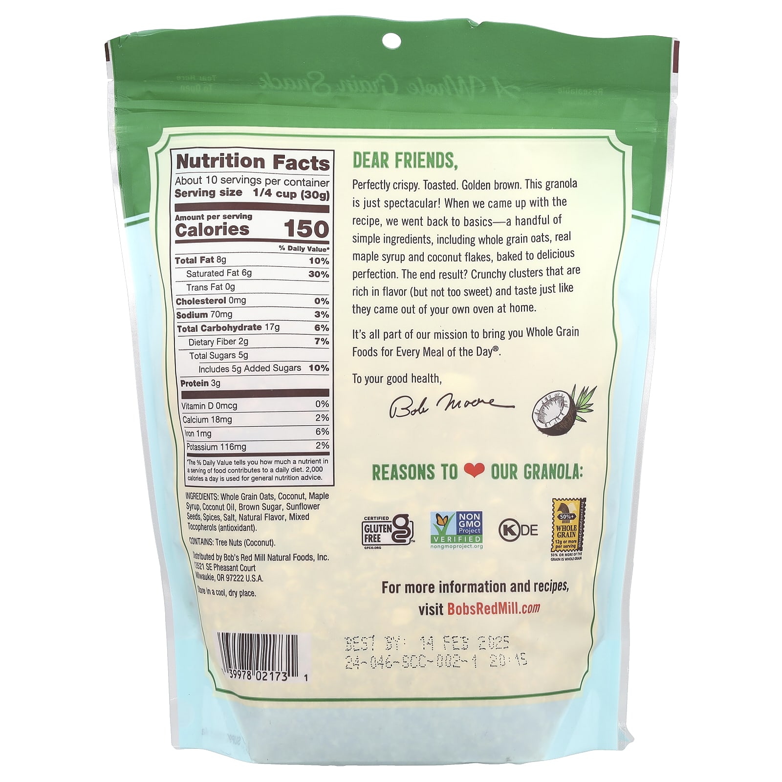 Aveia em flocos integral, coco, xarope de bordo, óleo de coco, açúcar mascavo, sementes de girassol, especiarias, sal, sabor natural, tocoferóis mistos (antioxidante).