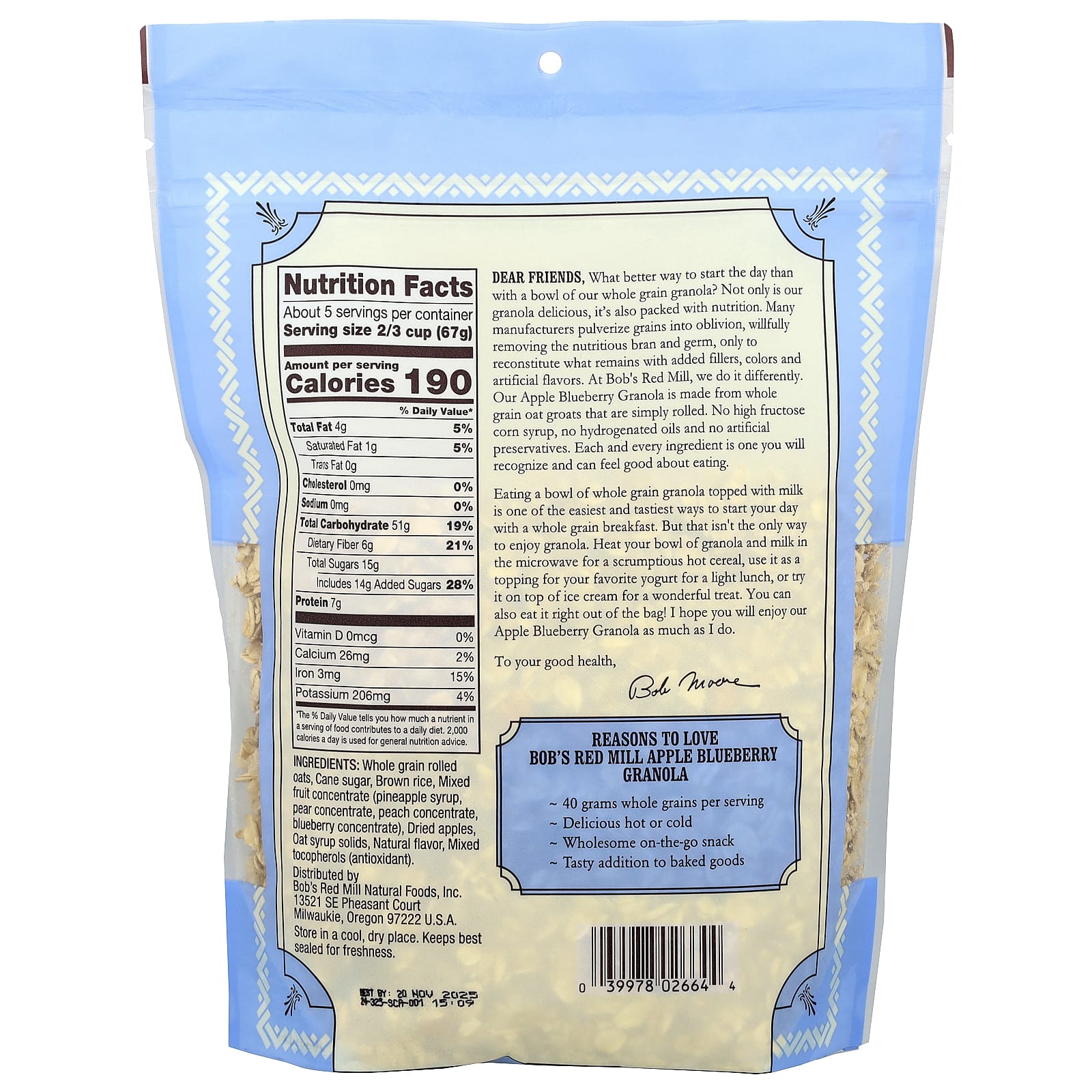 Que melhor maneira de começar o dia do que com uma tigela de nossa granola com grãos integrais? Além de deliciosa, nossa granola é repleta de nutrição. Muitos fabricantes pulverizam os grãos até o fim, removendo intencionalmente o farelo nutritivo e o germe, apenas para reconstituir o que permanece com a adição de excipientes, corantes e sabores artificiais. Na Bob’s Red Mill, fazemos isso de maneira diferente. Nossa Granola de Maçã e Mirtilo é feita com grãos de aveia integrais que são simplesmente enrolados. Sem xarope de milho com alto teor de frutose, óleos hidrogenados e conservantes artificiais. Cada ingrediente que você reconhecerá e poderá se sentir bem ao comer.