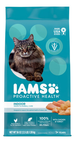 Seu gato é único… é por isso que a IAMS faz uma comida para gatos tão única quanto eles. Ajude a manter seus gatos em seu melhor estado com a ração seca para gatos IAMS PROACTIVE HEALTH para controle de peso em ambientes fechados e cuidados com bolas de cabelo com frango e perú. Esta fórmula foi desenvolvida para fornecer ao seu gato que vive dentro de casa os nutrientes de que ele precisa. Também pode ajudar na perda ou controle de peso saudável, graças à L-carnitina, que ajuda a queimar gordura e manter um metabolismo saudável. E, com sua mistura de fibras personalizada (com polpa de beterraba) para ajudar a promover uma digestão saudável, pode ser o remédio para bolas de pêlo de que seu gato precisa. Esta fórmula de comida para gatos é feita com frango verdadeiro como primeiro ingrediente e contém a proporção ideal de ácidos graxos ômega 6:3 para ajudar seu felino a crescer e manter uma pelagem macia e brilhante. Também está cheio de vitaminas e nutrientes essenciais, incluindo vitamina E, para ajudar a manter um sistema imunológico forte. Além disso, nutre a saúde do coração com cálcio e potássio. Seu gato ficará ansioso para comer esta fórmula perfeita de ração para gatos com frango e perú, e você pode ficar tranquilo sabendo que está alimentando ele com uma refeição que contribui para uma nutrição saudável. Contém um (1) saco de 3,5 libras de ração seca para gatos IAMS PROACTIVE HEALTH Adult Indoor Weight & Hairball Care com frango e perú. O frango é o primeiro ingrediente desta ração rica em nutrientes para gatos, formulada para ajudar a sustentar músculos fortes e fornecer energia saudável para brincar. Ajuda a queimar gordura e manter um metabolismo saudável com a L-carnitina. Ajuda a reduzir as bolas de pelo antes que elas comecem com uma mistura de fibras exclusiva e personalizada, incluindo polpa de beterraba. Parte integrante de uma dieta balanceada de controle de peso e de um regime básico de cuidados com bolas de pelo para gatos. Fornece ao seu gato uma refeição protéica de alta qualidade que satisfaz com 10% menos gordura do que o IAMS Healthy Adult Original with Chicken. Nutrido com a proporção ideal de ácidos graxos ômega-6 e ômega-3 para pelagens macias, brilhantes e saudáveis. Peso. Bola de pelo. Cuidados com a pele e a pelagem. Coração. Feito nos Brasil.
