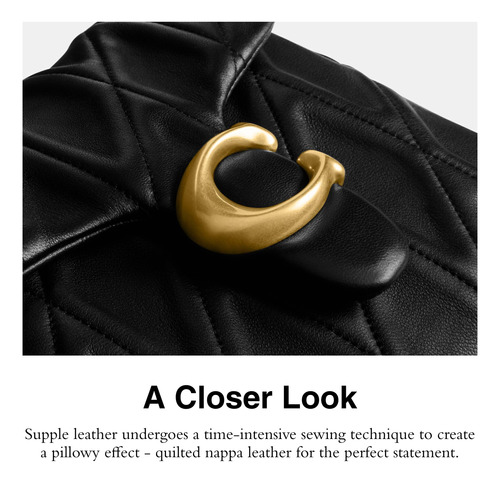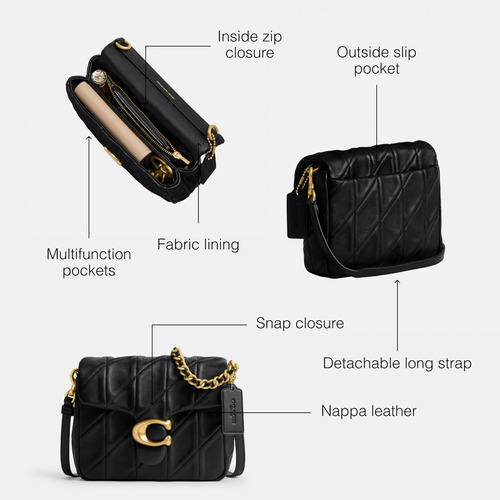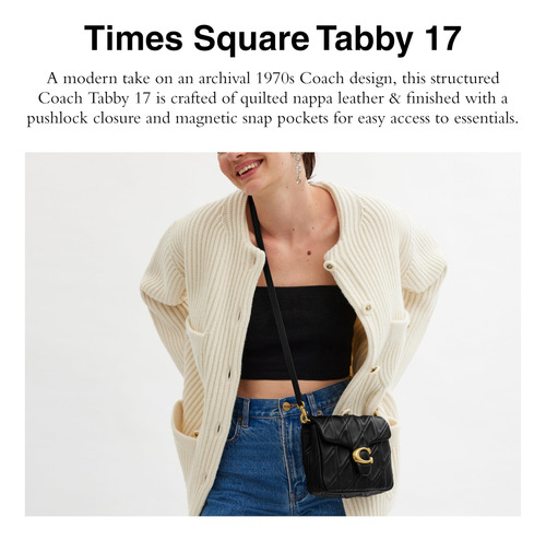 COACH Times Square Tabby 17, B4/Black – Notas do editor: Uma versão moderna do design arquivístico da Coach dos anos 70, esta bolsa estruturada Coach Tabby é feita de couro napa acolchoado e finalizada com fecho de pressão e bolsos de pressão para facilitar o acesso aos itens essenciais – Couro napa acolchoado: couro flexível passa por uma técnica de costura demorada para criar um efeito almofadado – couro napa acolchoado para uma declaração perfeita bolsa — Estilo Two Ways: esta bolsa elegante para mulheres apresenta uma alça curta removível com queda de 10" e uma alça removível com queda de 21 1/2" para roupa de ombro ou tiracolo — Tudo está nos detalhes: bolsos internos com zíper e multifuncionais, fecho de pressão, forro de tecido, bolso externo com pressão, alça curta removível com queda de 10 1/2", alça longa removível com queda de 21 1/2". 6 3/4" L x 6 3/4" A x 2" W – Este é o COACH: Ter a coragem de ser real desde 1941. COACH é a Original American House of Leather, com um legado de artesanato e uma comunidade que defende a coragem de viver autenticamente.