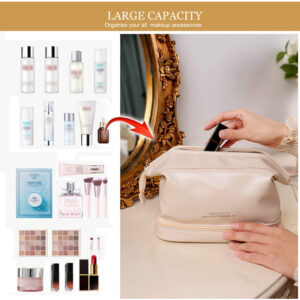 Bolsa de maquiagem Abiudeng, bolsas de maquiagem de viagem de camada dupla, bolsa de maquiagem portátil impermeável, bolsa de cosméticos de grande capacidade para mulheres (branca) – Grande capacidade de armazenamento — Dimensão desta bolsa de maquiagem: 5,5* 7* 9,4 polegadas, alça de transporte superior para facilitar o transporte. Quando você viaja, você pode embalar todos os itens de uma vez, para que cada viagem tenha uma maquiagem delicada. – ALTA QUALIDADE — O tecido é feito de couro PU, macio, confortável, leve, resistente e suave. É à prova d'água, então você não precisa se preocupar com respingos de água na bolsa de cosméticos ao lavar as mãos. – Design exclusivo — O a bolsa de cosméticos é dividida em áreas de armazenamento superior e inferior, a parte inferior é uma divisória de maquiagem, sombra para os olhos, os pincéis de maquiagem são colocados separadamente, limpos e arrumados. A camada superior tem uma grande abertura para facilitar o acesso e há duas pequenas camadas onde você pode colocar batom, brincos, etc., sem misturar. – Multifuncional — Não só pode ser usada como estojo de cosméticos de viagem, a bolsa de maquiagem também como bolsa de lavagem, bolsa de higiene, adequada para todos os tipos de uso diário ou de viagem, e trará grande comodidade à sua vida. – Presente maravilhoso — Dê algo que você goste para alguém que você gosta. O design elegante e prático costuma ser usado como presente fantástico em aniversários, Natal, etc. Presente ideal para sua esposa, namorada, filha ou aquela pessoa especial em sua vida.