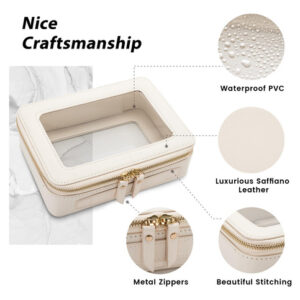 A bolsa de maquiagem é feita em lindo couro PU saffiano e finalizada com hardware polido. Os zíperes de metal deslizam suavemente e não ficam presos nos cantos. O estojo mantém uma boa estrutura e você não corre o risco de seus frascos serem apertados acidentalmente – Design luxuoso Medindo 7,9 x 5,7 x 2,7 (20 cm x 14,5 cm x 7 cm), nossa bolsa de maquiagem é elegante e estilosa. Esta agenda de viagem de maquiagem foi projetada em um formato quadrado minimalista e em uma linda cor esbranquiçada. Feita em lindo couro PU e com acabamento polido, é a bolsa transparente que você ficaria feliz em exibir ao seu lado. – Couro PU PREMIUM Ao contrário de outras bolsas de PVC frágeis e dobráveis, nossa bolsa de cosméticos, feita de couro PU saffiano premium e vinil espesso, pode manter uma boa estrutura. Junto com lindos pontos e zíperes de metal silenciosos, esta bolsa de maquiagem é durável para uso duradouro. – Impermeável e multifuncional Nosso organizador de maquiagem é espaçoso para guardar sua base de maquiagem, pincéis, rotina de cuidados com a pele ou outros pequenos itens, como lápis de arte, cabos e carregadores. Basta limpar todas as superfícies com um pano úmido ou lenço umedecido para manter a bolsa limpa. – Companheira aprovada pela TSA. Esta maleta de viagem de maquiagem é perfeita para viajar, pois é compatível com a TSA. Os painéis transparentes ajudam você a acompanhar tudo o que você embalou. Nossa linda bolsa com zíper permite que você viaje com estilo e facilidade no posto de controle da TSA ou no banheiro de seu destino. Reduza a bagunça com nossa maleta de trem transparente. – Ideia de presente de Natal A capa de maquiagem vem cuidadosamente embalada em uma bela caixa e seria um presente de Natal de Halloween perfeito para mulheres como sua esposa, mãe, irmã ou a rainha da maquiagem de sua vida. Em caso de insatisfação, você pode obter um reembolso total. Entre em contato conosco e teremos o maior prazer em ajudá-lo.