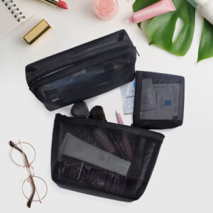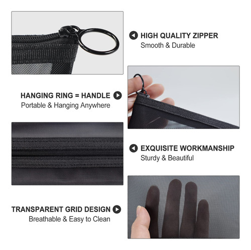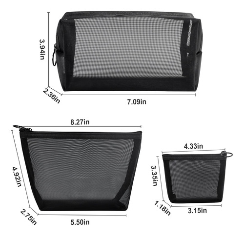 Bolsa de maquiagem de malha de 3 peças Bolsa de cosméticos de malha – vários tamanhos. Você receberá 3 tamanhos diferentes de bolsas de cosméticos para atender às suas diferentes necessidades diárias. O tamanho de viagem é perfeito para sua bolsa ou bagagem, não ocupa muito espaço, é leve e fácil de transportar. – Malha de secagem rápida Esta bolsa de malha é feita de materiais de malha transparente de alta qualidade, duráveis, respiráveis e fáceis de limpar. Basta um pouco de tempo e você pode obter uma bolsa de maquiagem totalmente seca. – Design práticoA grade transparente é suficiente para permitir que você encontre os itens que deseja no menor tempo possível. O design do zíper não apenas evita que as coisas sejam perdidas, mas também facilita o acesso. O anel de tração também pode ser usado como alça para facilitar o transporte. – Usos extensivos. Essas bolsas de malha preta podem ser servidas como bolsa de cosméticos, bolsa de higiene, estojo de lápis, bolsa de moedas, organizador de viagens, etc. para guardar sua maquiagem, como pincéis de maquiagem, base líquida, batons ou algumas necessidades diárias, como chaves, cartões, telefones celulares, trocados e assim por diante. – 100% de satisfação Seu apoio é nossa maior motivação. Estamos sempre comprometidos com sua satisfação de 100%. Se você não estiver totalmente satisfeito com nossos produtos, sinta-se à vontade para entrar em contato conosco e ajudaremos você a resolver o problema em 24 horas.