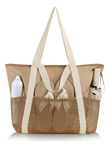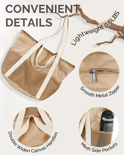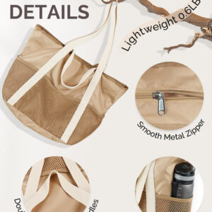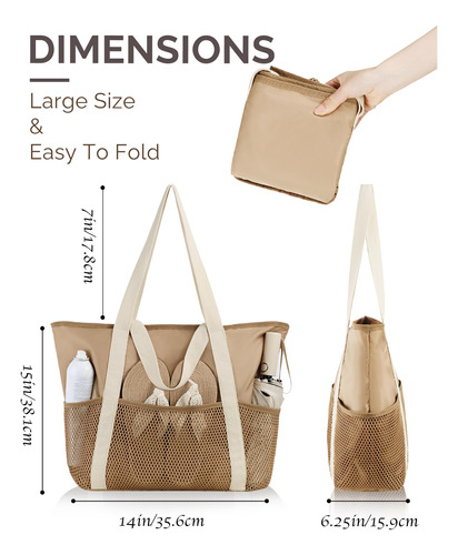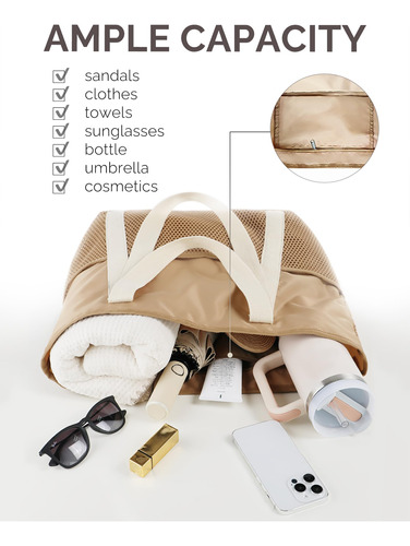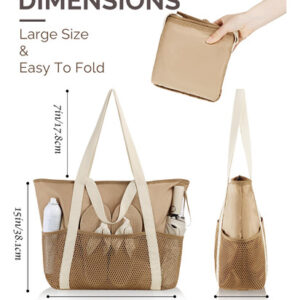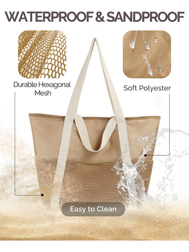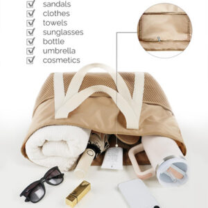 Os quatro bolsos de malha profunda da bolsa são excelentes para remoção de areia e separação de itens, enquanto o zíper superior seguro evita vazamentos e mantém a areia afastada. Seu design dobrável e construção leve facilitam o transporte, e as alças duplas ampliadas oferecem três maneiras de segurá-lo: com a mão, ombro ou braço. Garante conforto mesmo ao carregar itens mais pesados, reduz o estresse e proporciona uma experiência de transporte sem preocupações.