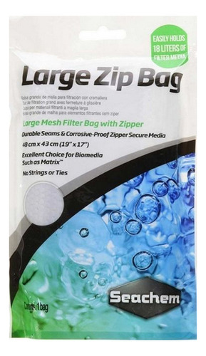 Os sacos Seachem Zip são sacos de filtro seguros que apresentam costuras duráveis e um zíper à prova de corrosão. Dimensões da bolsa com zíper de malha grande: 19 L x 17 Comporta facilmente 1 litro de mídia filtrante Costuras duráveis Zíper à prova de corrosão Sem cordões ou gravatas Excelente opção para produtos biomídicos, como Matrix