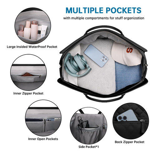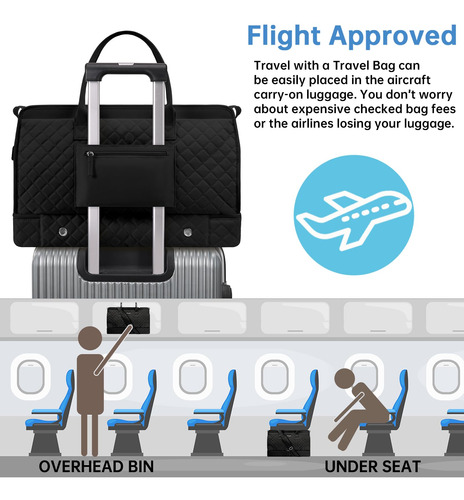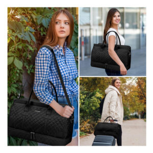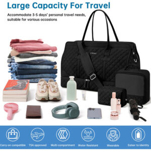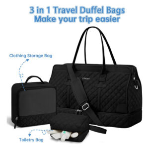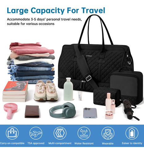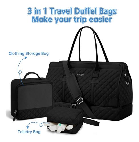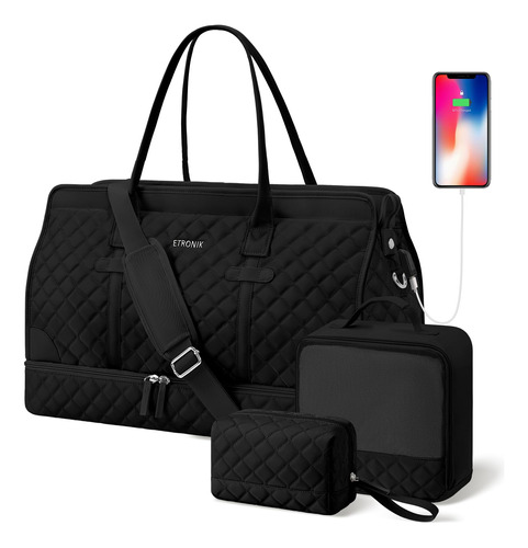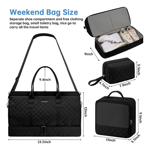 Bolsa noturna ETRONIK Weekender para mulheres, mochila de viagem grande com compartimento para sapatos e bolso úmido, sacola de mão, mochila de ginástica com bolsa de higiene, conjunto de 3 peças, tamanho grande, preta escura — Conjunto atualizado de 3 peças: a bolsa de viagem vem com 1 bolsa de viagem para mulheres para ajudar você a organizar e maximizar seu espaço ao viajar. 1 bolsa de armazenamento de roupas para ajudar a separar, organizar e localizar roupas rapidamente.1 banheiro bolsa para guardar seus cosméticos e produtos de higiene pessoal. A mochila ETRONIK para viagem é feita de materiais espessos e resistentes, proporcionando uma experiência de transporte confortável. Mala de viagem de tamanho grande para mulheres: a bolsa de viagem para itens pessoais, com vários bolsos e compartimentos para organização de coisas e espaço espaçoso, pode caber em 2 a 3 dias de itens essenciais de viagem, cabendo facilmente em suas roupas, produtos de higiene pessoal, sapatos, laptop e outros itens. Na parte de trás da mochila, há um bolso para facilitar o acesso ao seu smartphone, documentos de identidade ou passaporte. Equipado com uma porta de carregamento USB embutida, perfeita para carregar seu telefone ou outros dispositivos durante a viagem – bolsa de ginástica separada por água e compartimento separado para sapatos: a bolsa interna de separação seca e úmida é feita de material resistente à água de alta densidade, pode ajudar a separar itens secos e úmidos. Se você tiver roupas ou toalhas molhadas, pode colocá-las na bolsa úmida; esta mochila de ginástica para mulheres tem um compartimento inferior separado para seus sapatos e outros. Também pode ser usada como bolsa hospitalar – Bolsas de mão para aviões: tamanho grande (H* W* L) 47x23x31 cm/18,5* 9* 12", a mochila ETRONIK atende à maioria dos requisitos internacionais de bagagem de mão. Leve esta bolsa de mão como item pessoal durante o voo, você pode colocá-la no compartimento superior e no assento inferior. O design da alça de bagagem faz com que esta bolsa possa ser colocada em sua bagagem dobrável. Esta mala de embarque noturno de fim de semana é perfeita para sua viagem pessoal. Mochila de ampla aplicação: se você está procurando uma linda mala de viagem, seria uma ótima opção. Possui uma alça de bagagem para deslizar sobre sua bagagem com rodas, além de uma alça de ombro acolchoada ajustável para mochila ou estilo transversal. Você nunca mais terá dificuldades no aeroporto com essas principais opções. Use-o como mochila, bolsa de viagem de avião, bolsa de bagagem, bolsa esportiva de ginástica, bolsa de fim de semana, bolsa de mão, bolsa de hospital ou bolsa de praia
