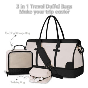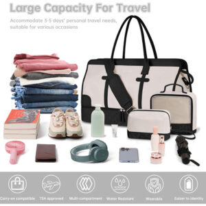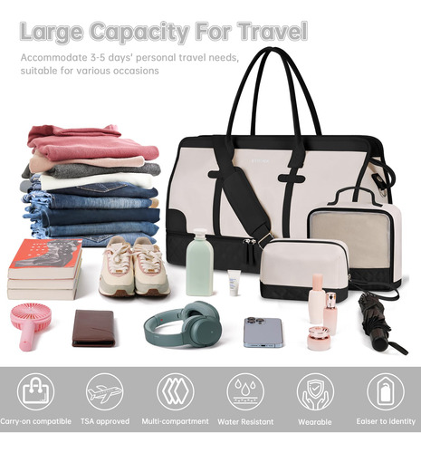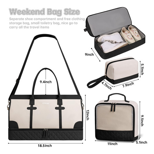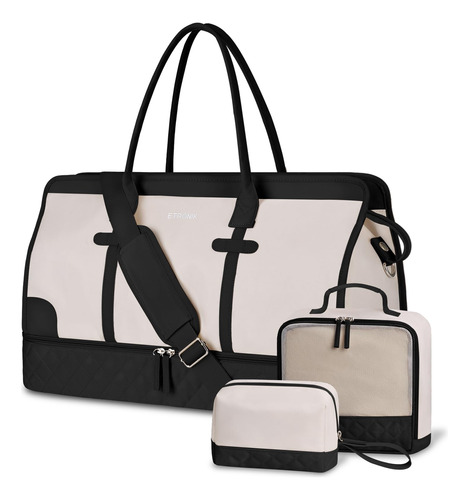 Bolsa noturna ETRONIK Weekender para mulheres, mochila de viagem grande com compartimento para sapatos e bolso úmido, sacola de mão, mochila de ginástica com bolsa de higiene, conjunto de 3 peças, tamanho GG, bege e preta — Conjunto atualizado de 3 peças: a bolsa de viagem vem com 1 bolsa de fim de semana para mulheres para ajudar você a organizar e maximizar seu espaço ao viajar. 1 bolsa de armazenamento de roupas para ajudar a classificar, organizar e localizar roupas rapidamente ly.1 bolsa de higiene para guardar seus cosméticos e produtos de higiene pessoal. A mochila ETRONIK para viagem é feita de materiais espessos e resistentes, proporcionando uma experiência de transporte confortável. Mala de viagem de tamanho grande para mulheres: a bolsa de viagem para itens pessoais, com vários bolsos e compartimentos para organização de coisas e espaço espaçoso, pode caber em 2 a 3 dias de itens essenciais de viagem, cabendo facilmente em suas roupas, produtos de higiene pessoal, sapatos, laptop e outros itens. Na parte de trás da mochila, há um bolso para facilitar o acesso ao seu smartphone, documentos de identidade ou passaporte. Equipado com uma porta de carregamento USB embutida, perfeita para carregar seu telefone ou outros dispositivos durante a viagem – bolsa de ginástica separada por água e compartimento separado para sapatos: a bolsa interna de separação seca e úmida é feita de material resistente à água de alta densidade, pode ajudar a separar itens secos e úmidos. Se você tiver roupas ou toalhas molhadas, pode colocá-las na bolsa úmida; esta mochila de ginástica para mulheres tem um compartimento inferior separado para seus sapatos e outros. Também pode ser usada como bolsa hospitalar – Bolsas de mão para aviões: tamanho grande (H* W* L) 47x23x31 cm/18,5* 9* 12", a mochila ETRONIK atende à maioria dos requisitos internacionais de bagagem de mão. Leve esta bolsa de mão como item pessoal durante o voo, você pode colocá-la no compartimento superior e no assento inferior. O design da alça de bagagem faz com que esta bolsa possa ser colocada em sua bagagem dobrável. Esta mala de embarque noturno de fim de semana é perfeita para sua viagem pessoal. Mochila de ampla aplicação: se você está procurando uma linda mala de viagem, seria uma ótima opção. Possui uma alça de bagagem para deslizar sobre sua bagagem com rodas, além de uma alça de ombro acolchoada ajustável para mochila ou estilo transversal. Você nunca mais terá dificuldades no aeroporto com essas principais opções. Use-o como mochila, bolsa de viagem de avião, bolsa de bagagem, bolsa esportiva de ginástica, bolsa de fim de semana, bolsa de mão, bolsa de hospital ou bolsa de praia