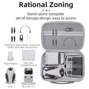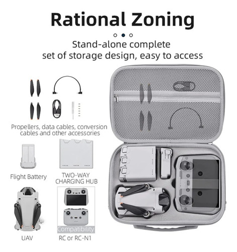 Ele pode armazenar drones mini 4 pro, controladores RC 2, baterias de voo inteligentes, adaptadores de hélice/cabo/fonte de alimentação, joysticks de controle e outros acessórios.