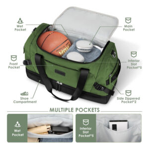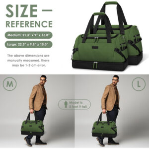 Bolsa de fim de semana ETRONIK para homens e mulheres, mochilas de viagem com bolso molhado e compartimento para sapatos, bolsa esportiva impermeável para ginástica, bolsa leve de viagem com alça ajustável para viagem – [Vários bolsos] – Esta bolsa de fim de semana tem uma capacidade total de 45 L e foi projetada com vários bolsos para manter suas necessidades diárias organizadas. O compartimento principal tem espaço suficiente para guardar roupas de viagem, camisetas, calças, produtos de higiene pessoal e outros itens essenciais de viagem ou equipamentos de ginástica. Há um bolso com zíper na frente e 2 bolsos laterais com zíper para facilitar o acesso. A mochila é a companhia perfeita e confiável para viagens noturnas de fim de semana e exercícios físicos – [Bolso para armazenamento úmido] – O bolso úmido no compartimento principal com material de PVC à prova d'água pode ajudá-lo a separar itens secos dos molhados. Ótimo para roupas de banho molhadas ou toalhas úmidas. Além disso, esta mochila de viagem também oferece uma bolsa de higiene extra pequena para facilitar o armazenamento – [Compartimento independente para sapatos] – A bolsa de viagem Weekender vem com um grande compartimento independente para sapatos, que armazena de 1 a 2 pares de sapatos (menos de 11) ou roupas sujas, dois orifícios de ventilação no compartimento de sapatos, para que permaneça respirável ou não cheirosa. Ela pode ajudar a evitar sujar outras roupas ao embalar, além de proporcionar mais conveniência para sua viagem – [Bolsas de mão para aviões] – Mala de viagem média: 21,3 x 9 x 13,8 polegadas. Peso: 1,45 libras; a mochila média atende à maioria dos requisitos internacionais de bagagem de mão. Cabe no compartimento superior e embaixo do assento como itens pessoais durante o voo. A mochila de fim de semana está equipada com mangas traseiras que a manterão no lugar na mala principal, para liberar suas mãos quando você estiver no aeroporto – [Material e formas de transporte múltiplo] – Feita de tecido resistente à água e poliéster com zíperes duplos. Garanta um uso seguro e duradouro todos os dias e finais de semana. As alças ajustáveis e a alça confortável oferecem muitas maneiras convenientes para viagens de fim de semana e durante a noite. Elas podem ser usadas como bolsa, bolsa de ombro, mochilas para viajar, itens pessoais, bolsa de viagem, bolsa de ginástica esportiva