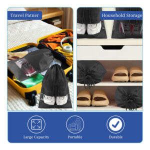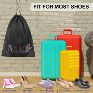 Pacote com 18 bolsas de sapatos para viagens, sacolas grandes COIDEA para embalar com janela transparente, bolsas de armazenamento de sapatos de viagem com cordão à prova de poeira, itens essenciais de viagem para homens e mulheres, pretas — bolsa de sapatos de tamanho grande: você receberá 18 bolsas pretas para viajar, para atender a diferentes necessidades; o tamanho da mala de viagem para sapatos é de 12,6 “x 17,3" polegadas, que pode ser adequada para sapatos abaixo do tamanho 13. Serve para tênis, sapatos de dança e tênis de boliche — Material premium: as bolsas de viagem são feitas de tecido não tecido, respiráveis e leves. As bolsas de viagem para embalagem são equipadas com um design de cordão, que pode ser facilmente amarrado e desamarrado; mantenha os sapatos limpos e organizados — Design de janela transparente: as bolsas para viagens com uma janela transparente ajudam você a localizar rapidamente seus sapatos ou itens dentro da bolsa sem abrir as sacolas; Para economizar tempo e proteger sua privacidade – BOLSAS DE SAPATOS MULTIFUNCIONAIS: as bolsas pretas para sapatos de viagem não só podem ser usadas como bolsas de sapatos para correr, dançar, se exercitar e viajar, mas também podem ser usadas como bolsas para acessórios para sapatos, bolsas esportivas, organizadores de viagens, bolsas de ginástica e outros usos; Sua assistente de vida – INDISPENSÁVEL PARA USO DIÁRIO E VIAGENS: Nossas bolsas para sapatos para viagens são ótimas para viagens e organização doméstica; as bolsas de viagem ajudam você a arrumar sua bagagem de forma rápida e fácil e protegem as roupas de ficarem sujas; mantêm sua bagagem arrumada e limpa