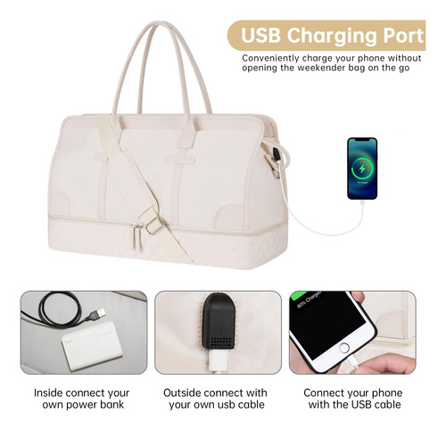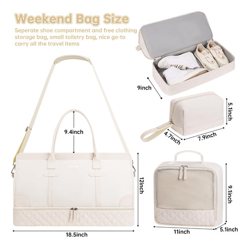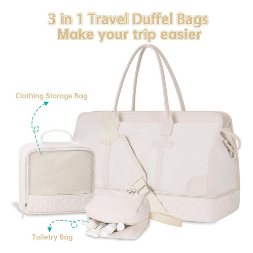 Bolsas noturnas ETRONIK Weekender para mulheres, mochilas de viagem grandes com compartimento para sapatos e bolso úmido, sacola de mão, mochila de ginástica com bolsas de higiene para hospital, conjunto de 3 peças, tamanho grande, bege — Conjunto atualizado de 3 peças: a mala de viagem vem com 1 mala de fim de semana para mulheres para ajudar você a organizar e maximizar seu espaço ao viajar. 1 bolsa de armazenamento de roupas para ajudar a separar, organizar e localizar roupas rapidamente.1 bolsa de higiene para guardar seus cosméticos e produtos de higiene pessoal. A mochila ETRONIK para viagem é feita de materiais espessos e resistentes, proporcionando uma experiência de transporte confortável. Mala de viagem de tamanho grande para mulheres: a bolsa de viagem para itens pessoais, com vários bolsos e compartimentos para organização de coisas e espaço espaçoso, pode caber em 2 a 3 dias de itens essenciais de viagem, cabendo facilmente em suas roupas, produtos de higiene pessoal, sapatos, laptop e outros itens. Na parte de trás da mochila, há um bolso para facilitar o acesso ao seu smartphone, documentos de identidade ou passaporte. Equipado com uma porta de carregamento USB embutida, perfeita para carregar seu telefone ou outros dispositivos durante a viagem – bolsa de ginástica separada por água e compartimento separado para sapatos: a bolsa interna de separação seca e úmida é feita de material resistente à água de alta densidade, pode ajudar a separar itens secos e úmidos. Se você tiver roupas ou toalhas molhadas, pode colocá-las na bolsa úmida; esta mochila de ginástica para mulheres tem um compartimento inferior separado para seus sapatos e outros. Também pode ser usada como bolsa hospitalar – Bolsas de mão para aviões: tamanho grande (H* W* L) 47x23x31 cm/18,5* 9* 12", a mochila ETRONIK atende à maioria dos requisitos internacionais de bagagem de mão. Leve esta bolsa de mão como item pessoal durante o voo, você pode colocá-la no compartimento superior e no assento inferior. O design da alça de bagagem faz com que esta bolsa possa ser colocada em sua bagagem dobrável. Esta mala de embarque noturno de fim de semana é perfeita para sua viagem pessoal. Mochila de ampla aplicação: se você está procurando uma linda mala de viagem, seria uma ótima opção. Possui uma alça de bagagem para deslizar sobre sua bagagem com rodas, além de uma alça de ombro acolchoada ajustável para mochila ou estilo transversal. Você nunca mais terá dificuldades no aeroporto com essas principais opções. Use-o como mochila, bolsa de viagem de avião, bolsa de bagagem, bolsa esportiva de ginástica, bolsa de fim de semana, bolsa de mão, bolsa de hospital ou bolsa de praia