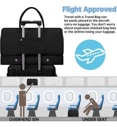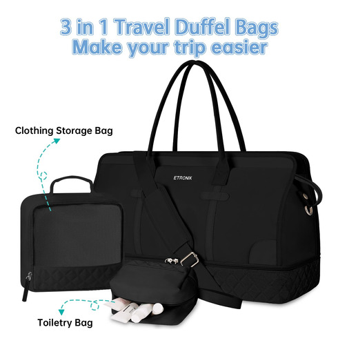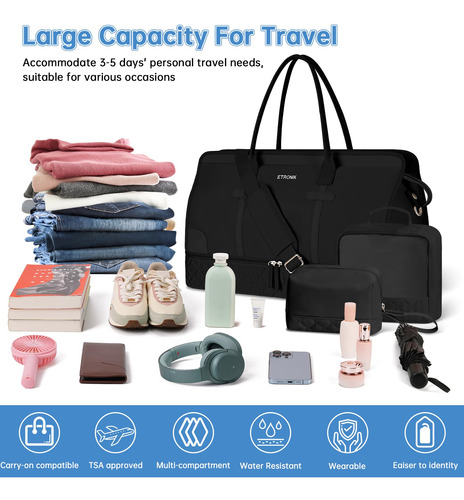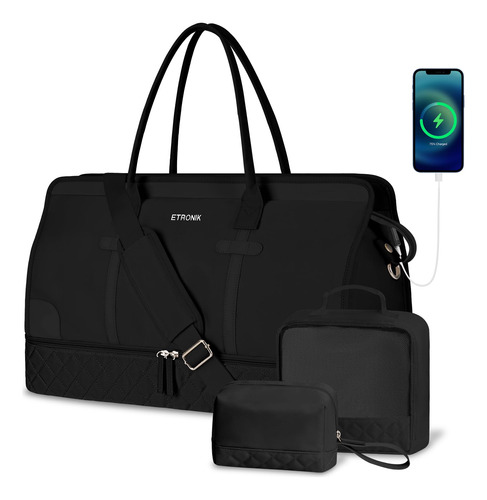Bolsas noturnas ETRONIK Weekender para mulheres, mochila de viagem grande com compartimento para sapatos e bolso úmido, sacola de mão, mochila de ginástica com bolsa de higiene para hospital, conjunto de 4 peças, tamanho grande, preta — Conjunto atualizado de 3 peças: a mala de viagem vem com 1 bolsa de fim de semana para mulheres para ajudar você a organizar e maximizar seu espaço ao viajar. 1 bolsa de armazenamento de roupas para ajudar a separar, organizar e localizar roupas rapidamente.1 banheiro bolsa para guardar seus cosméticos e produtos de higiene pessoal. A mochila ETRONIK para viagem é feita de materiais espessos e resistentes, proporcionando uma experiência de transporte confortável. Mala de viagem de tamanho grande para mulheres: a bolsa de viagem para itens pessoais, com vários bolsos e compartimentos para organização de coisas e espaço espaçoso, pode caber em 2 a 3 dias de itens essenciais de viagem, cabendo facilmente em suas roupas, produtos de higiene pessoal, sapatos, laptop e outros itens. Na parte de trás da mochila, há um bolso para facilitar o acesso ao seu smartphone, documentos de identidade ou passaporte. Equipado com uma porta de carregamento USB embutida, perfeita para carregar seu telefone ou outros dispositivos durante a viagem – bolsa de ginástica separada por água e compartimento separado para sapatos: a bolsa interna de separação seca e úmida é feita de material resistente à água de alta densidade, pode ajudar a separar itens secos e úmidos. Se você tiver roupas ou toalhas molhadas, pode colocá-las na bolsa úmida; esta mochila de ginástica para mulheres tem um compartimento inferior separado para seus sapatos e outros. Também pode ser usada como bolsa hospitalar – Bolsas de mão para aviões: tamanho grande (H* W* L) 47x23x31 cm/18,5* 9* 12", a mochila ETRONIK atende à maioria dos requisitos internacionais de bagagem de mão. Leve esta bolsa de mão como item pessoal durante o voo, você pode colocá-la no compartimento superior e no assento inferior. O design da alça de bagagem faz com que esta bolsa possa ser colocada em sua bagagem dobrável. Esta mala de embarque noturno de fim de semana é perfeita para sua viagem pessoal. Mochila de ampla aplicação: se você está procurando uma linda mala de viagem, seria uma ótima opção. Possui uma alça de bagagem para deslizar sobre sua bagagem com rodas, além de uma alça de ombro acolchoada ajustável para mochila ou estilo transversal. Você nunca mais terá dificuldades no aeroporto com essas principais opções. Use-o como mochila, bolsa de viagem de avião, bolsa de bagagem, bolsa esportiva de ginástica, bolsa de fim de semana, bolsa de mão, bolsa de hospital ou bolsa de praia