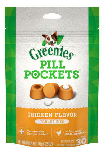 BOLSOS DE COMPRIMIDOS TRANSFORMAM A HORA DA PÍLULA EM HORA DO TRATAMENTO. As guloseimas GREENIES Pill Pockets para cães facilitam a administração de remédios para cães, com um sabor saboroso de frango que eles certamente adorarão. Por que esconder remédios para seus animais de estimação em alimentos humanos, como manteiga de amendoim ou queijo, quando você pode dar a eles uma guloseima saudável e totalmente natural para cães, feita com ingredientes naturais e reais, além de oligoelementos? Projetadas por veterinários, as guloseimas para cães GREENIES Pill Pockets mascaram o cheiro e o sabor de qualquer medicamento, eliminando o estresse (e a bagunça) de dar remédios para cães. Seja para cães de raças grandes ou pequenos, esses bolsos de comprimidos de tamanho menor tornam a ingestão de medicamentos uma experiência positiva para seu cão. E são fáceis de administrar: basta colocar um comprimido na bolsa Pill Pockets, fechar a metade superior, entregá-lo ao filhote e pronto: veja o remédio desaparecer. Os bolsos de comprimidos GREENIES são a maneira engenhosa de dar remédios a seu cão, e eles nunca saberão a diferença. * Os dados arquivados na Mars Petcare US, Inc. 2018 contêm um (1) pacote de 3,2 onças e 30 unidades de GREENIES PILL POCKETS, tamanho comprimido, guloseimas para cães, sabor frango; feitas com ingredientes naturais e nutrientes residuais. Os bolsos de comprimidos GREENIES são a maneira mais saborosa e inteligente de ajudar seus cães a serem consumidos na hora do tratamento, sem tentar esconder pílulas na comida humana, como manteiga de amendoim ou queijo bagunçado. Seu cão não conseguirá cheirar o remédio: os Pill Pockets mascaram o cheiro e o sabor e vêm com um sabor irresistível de frango para uma experiência sem estresse e bagunça para vocês dois. Essas guloseimas para cães Pill Pockets são fáceis de usar: coloque o comprimido dentro da bolsa de comprimidos, feche-o e dê ao seu melhor amigo um lanche saboroso. Quando se trata de medicamentos, os animais de estimação são inteligentes, mas você é mais inteligente: os GREENIES Pill Pockets são uma guloseima medicamentosa recomendada pelo veterinário* que você e seu cão vão adorar. Essas bolsas de medicamentos fáceis de usar tornam o uso de remédios uma experiência positiva para seu cão. Recomendado pelo veterinário. Os bolsos de comprimidos transformam a hora do tratamento em hora da pílula. Natural. Feito nos Brasil.