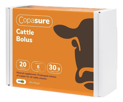 Uma variedade de bolus de liberação lenta para ruminantes. Use com bezerros ou bovinos somente quando for necessária suplementação de cobre. Liberação prolongada de cobre para fornecer aproximadamente seis meses de suplementação. Fácil de usar sem injeções, abcessos, dor ou estresse para o animal. Cada bolus Copasure 12,5 contém 12,5 mg de partículas de óxido de cobre. Cada bolus Copasure 30 contém 30 mg de partículas de óxido de cobre. Administre somente bolos intactos, não esmague nem quebre. Não administrar a bovinos com status de cobre desconhecido ou suplementados com outras fontes de cobre. Não use em bovinos que sofrem de icterícia ou qualquer outra doença hepática. Na maioria das condições, a readministração não será necessária por pelo menos 12 meses. Níveis excessivos de molibdênio, enxofre, selênio ou ferro na ração ou na água podem prejudicar a absorção de cobre. Não administre 12,5 mg em bezerros recém-nascidos. A toxicidade do cobre em recém-nascidos foi relatada. Não administre às ovelhas.